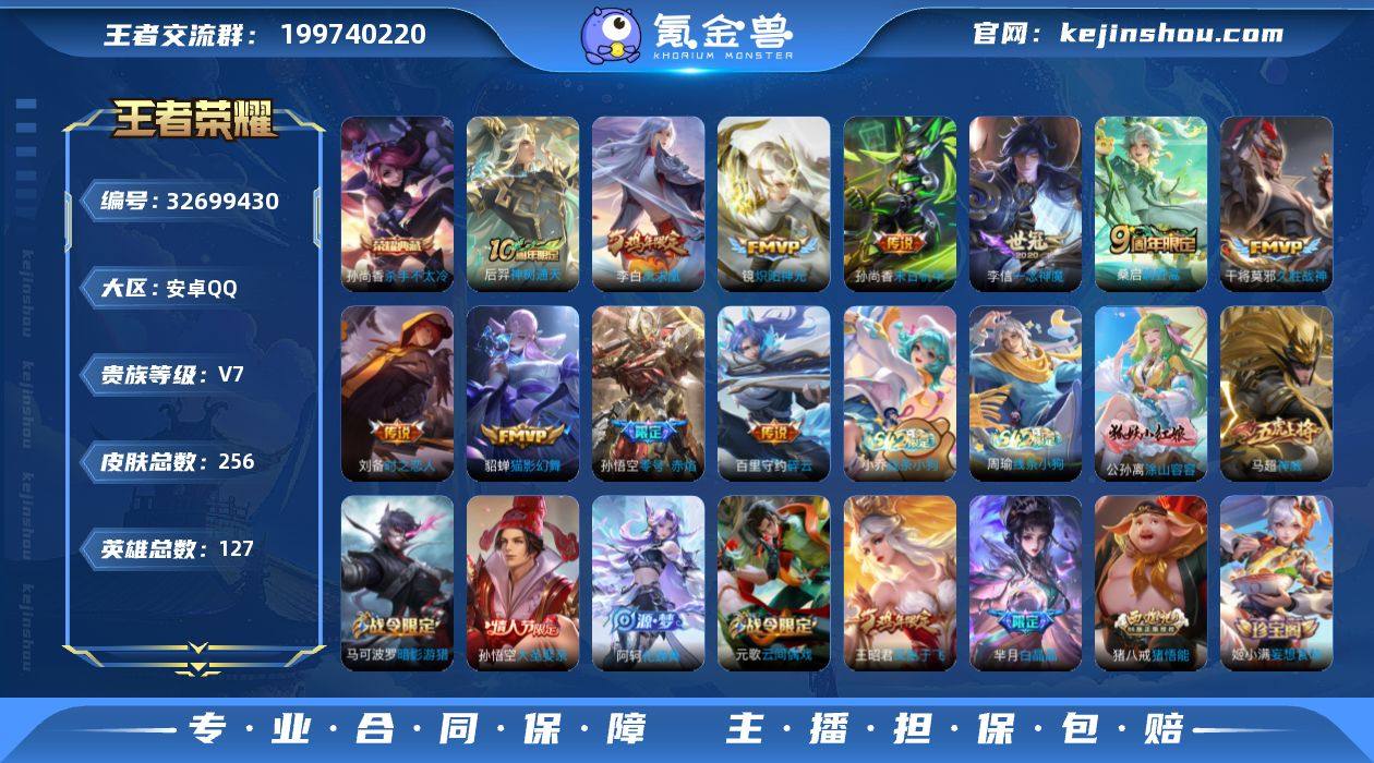 安卓Q-V7-永恒钻石IV段位-127英雄-256皮肤-1典藏皮肤-11传说-63史诗 【荣耀典藏】:孙尚香杀手不太冷 【传说皮肤】:后羿神树通天,桑启鸣野蒿,百里守约碎云,镜炽阳神光,孙悟空零号赤焰,李信一念神魔,刘备时之恋人,貂蝉猫影幻舞,干将莫邪久胜战神,李白凤求凰,孙尚香末日机甲 【限定皮肤】:白起狰,狄仁杰阴阳师,虞姬凯尔特女王,赵云皇家上将,嬴政优雅恋人,庄周蜃楼王,庄周高山流水,高渐离死亡摇滚,钟无艳王者之锤,孙膑妖精王,扁鹊炼金王,芈月白晶晶,芈月幻夜卜梦,元歌云间偶戏,元歌无心,夏侯惇朔风刀,甄姬落雪兰心,曹操烛龙,马可波罗暗影游猎,狄仁杰魔术师,狄仁杰万华元夜,达摩星际陆战队,达摩沙漠行僧,项羽海滩派对,老夫子醍醐杖,程咬金演武夺筹,刘邦夺宝奇兵,王昭君凤凰于飞,兰陵王金庭之子,亚瑟狮心王,亚瑟潮玩骑士王,孙悟空大圣娶亲,孙悟空零号赤焰,牛魔御旌,李元芳云中旅人,钟馗驱傩正仪,雅典娜单词大作战,雅典娜黎明之约,蔡文姬繁星吟游,太乙真人饕餮,太乙真人华丽摇滚,鬼谷子原初探秘者,鬼谷子五谷丰年,黄忠火炮绅士,苏烈千军破阵,百里玄策原初追逐者,弈星混沌棋,梦奇顽趣,沈梦溪大漠名商,明世隐疑决卦,裴...
