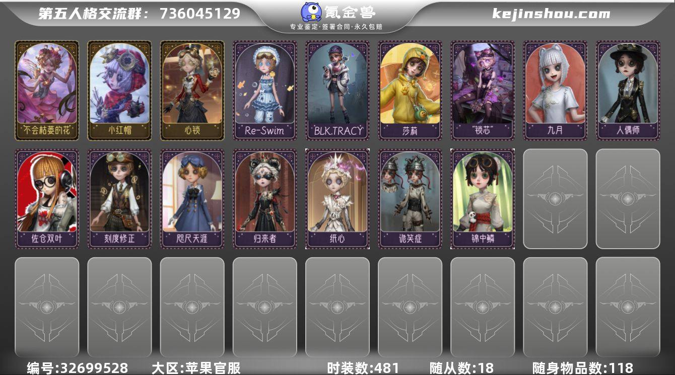 第五人格ios官服机械师情号 资源多 皮肤丰富(心锁、小红帽、BLK TRACY、九月、锦中鳞、刻度修正、人偶师、佐仓双叶、锁芯等) 限定联动、稀有皮都有,奇珍、独特、稀世、奇珍齐,随身物品也全 账号安全,支持换绑 爽快可聊,喜欢直接拍