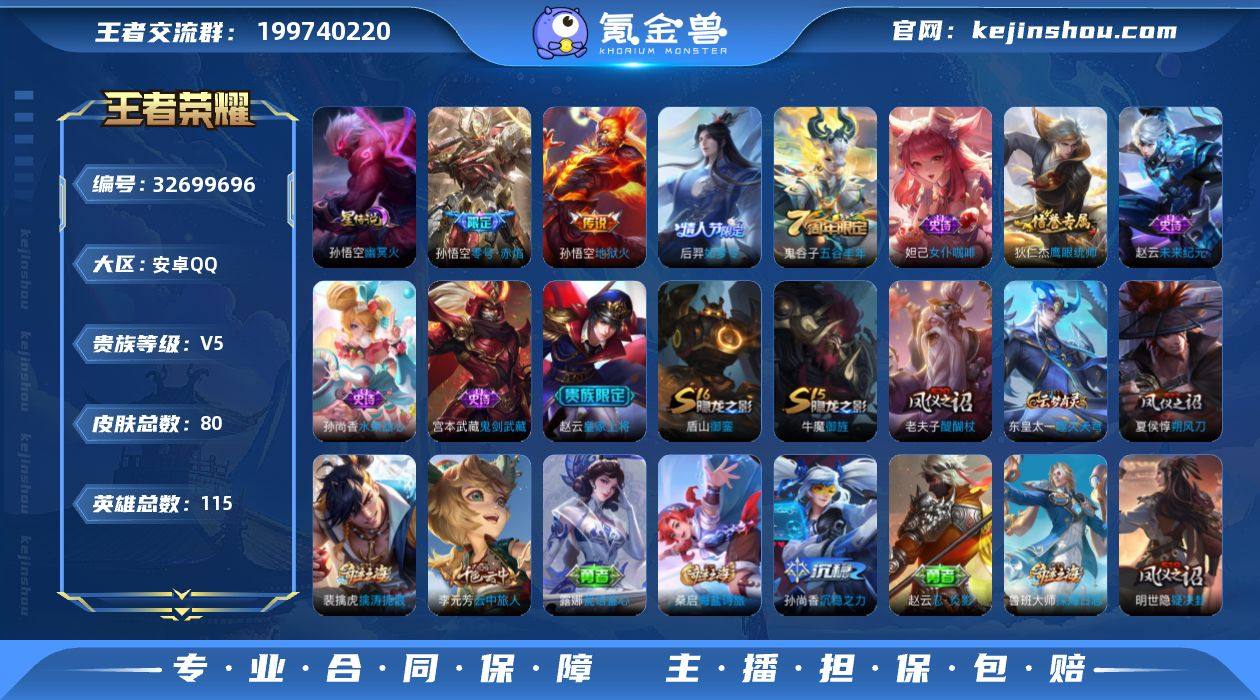 【特价野王号·v5·2传说·零号赤焰·幽冥火·如梦令】 安卓Q-V5-尊贵铂金I段位-115英雄-80皮肤-2传说-8史诗 【传说皮肤】:孙悟空零号赤焰,孙悟空地狱火 【限定皮肤】:狄仁杰阴阳师,赵云皇家上将,夏侯惇朔风刀,狄仁杰万华元夜,达摩沙漠行僧,项羽海滩派对,老夫子醍醐杖,程咬金演武夺筹,兰陵王金庭之子,孙悟空零号赤焰,牛魔御旌,后羿如梦令,李元芳云中旅人,钟馗驱傩正仪,鬼谷子五谷丰年,苏烈千军破阵,弈星混沌棋,沈梦溪大漠名商,明世隐疑决卦,裴擒虎擒涛扼浪,盾山御銮,鲁班大师探海日志,桑启海盐诗旅,周瑜熔金海岸 【赛季限定】:牛魔御旌,盾山御銮,夏侯惇朔风刀,弈星混沌棋,明世隐疑决卦,老夫子醍醐杖,狄仁杰万华元夜,程咬金演武夺筹,钟馗驱傩正仪,苏烈千军破阵,达摩沙漠行僧,兰陵王金庭之子,沈梦溪大漠名商,李元芳云中旅人,桑启海盐诗旅,裴擒虎擒涛扼浪,鲁班大师探海日志,东皇太一噬灭天穹 【史诗皮肤】:鬼谷子五谷丰年,后羿如梦令,狄仁杰鹰眼统帅,妲己女仆咖啡,孙尚香水果甜心,宫本武藏鬼剑武藏,赵云未来纪元,赵云皇家上将 【其他皮肤】:干将莫邪雾都夜雨,东皇太一噬灭天穹,周瑜熔金海岸,鲁班大师探海日志,太乙真人劲辣...