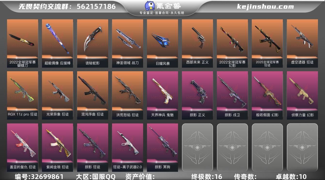 【套装】:2022全球冠军赛套装,掠影套装 【英雄】:幻棱,炼狱,维斯,暮蝶,钛狐,壹决,铁臂,捷风,雷兹,幽影,不死鸟,贤者,猎枭,蝰蛇,零,芮娜,奇乐,尚勃勒,霓虹,斯凯,夜露,星礈,K/O,海神,盖可,黑梦,钢锁 【近战武器】:近战武器-2022全球冠军赛 蝴蝶刀,近战武器-影钩,近战武器-鬼丸国纲,近战武器-超能偶像 应援棒,近战武器-影刃,近战武器-诡秘蛇影 军刀,近战武器-神圣领域 战刀,近战武器-日耀风暴 遗器 【狂徒】:狂徒-2025全球冠军赛,狂徒-洪荒怒焰,狂徒-混沌序曲,狂徒-虚空遗器,狂徒-RGX 11z Pro,狂徒-光荣异象,狂徒-掠影,狂徒-盖亚的复仇,狂徒-紫阙金琅,狂徒-离子武器//2.0,狂徒-超能偶像,狂徒-诡秘蛇影 【幻影】:幻影-2022全球冠军赛,幻影-般若假面,幻影-侦察力量,幻影-神圣领域,幻影-聚合之力,幻影-末日之翼 【戍卫】:戍卫-掠影,戍卫-超能偶像,戍卫-月球哨兵,戍卫-折光棱晶 【獠犬】:獠犬-神圣领域,獠犬-采蜜小蜂队 【冥驹】:冥驹-掠影,冥驹-星云暗涌 【飞将】:飞将-聚合之力,飞将-末日之翼 【莽侠】:莽侠-诡秘蛇影,莽侠-月球哨兵 【战神】:战神-神圣领域,战神-采蜜小蜂队 【奥丁】:奥丁-末日之翼 【判官...