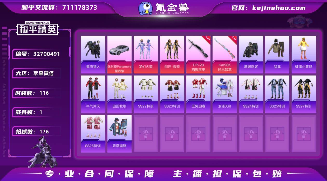 2粉装 5粉枪 1载具 1稀有装备 116套装 176枪皮 24热门 保时捷Panamera(星辰紫) 都市猎人 稀有紫装-都市猎人 梦幻火箭 吉莉礼服 虎虎生威吉莉 阳光火鸡 黄色名流 猛禽 甜蜜告白 破晓战魂 鹤鸣 荣耀 耀粉歌者 潮流炫酷 福星高照 柠萌假日 青玉碎影 冥星暗影 龟仙人 涂山之恋 冷焰舞者 空岛之星 惊鸿侠骨 萌趣咩咩 竞技名士 娇憨猪猪 锦衣飞扬 灼焰舞者 龙的传人 玉兔迎春 特战装甲 田园牧歌 轻风白浪 湖蓝色名流 光之冒险 绯格组合 冰冻风暴 绮丽涂鸦 耀眼新星 旭日情侣 缤纷果语 野性战心 幻世战舞者 麻辣教官 人气偶像 夏日音浪 探宝勇士 创世·救赎 S686-生命誓言 GROZA-影袭 SCAR-L-黄金龙骨 S1897-炫彩节奏 Mini14-耀粉歌者 Kar98K-影袭 MK20-H-莲影清波 S12K-幻世战舞者 M416-红色方程式 汤姆逊-耀粉歌者 S12K-娇憨猪猪 S686-红色方程式 S12K-破晓战魂 AUG-耀粉歌者 S12K-玩趣呆呆 AUG-甜蜜菠萝 野牛-乌木金纹 M24-影袭 SPAS-12-田园牧歌 Mk47-炫光之旅 AC-VAL-天降萌叽 AC-VAL-乌木金纹 蜜獾-天降萌叽 MG3-惊鸿侠骨 DP-28-彩虹符号 蜜獾-娇憨猪猪 Kar98K-炫彩节奏 M24-炫彩节奏 M24-乌木金纹 AUG-天降萌叽 QBZ-彩虹符号 莫辛纳甘-乌木金纹 AMR-乌木金纹 S12K-夜灯 M200-...