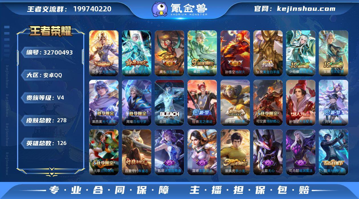 安卓Q-V4-永恒钻石II段位-126英雄-278皮肤-1典藏皮肤-5传说-77史诗 【英雄全皮】:孙权全皮 【荣耀典藏】:花木兰九霄神辉 【传说皮肤】:桑启鸣野蒿,典韦战鼓燎原,诸葛亮时雨天司,张良黄金白羊座,孙悟空地狱火 【限定皮肤】:虞姬夏日便利店,杨戬破阵退雄兵,狄仁杰阴阳师,赵云皇家上将,墨子神迹守卫,嬴政优雅恋人,嬴政白昼王子,孙尚香蔷薇恋人,鲁班七号狮舞东方,高渐离玩趣恶龙,阿轲迷踪丽影,吕布猎兽之王,元歌云间偶戏,元歌无心,夏侯惇朔风刀,甄姬游园惊梦,典韦穷奇,狄仁杰魔术师,狄仁杰万华元夜,达摩沙漠行僧,项羽海滩派对,老夫子醍醐杖,老夫子航海奇遇记,程咬金演武夺筹,刘邦夺宝奇兵,韩信逐梦之影,兰陵王金庭之子,亚瑟潮玩骑士王,孙悟空大圣娶亲,孙悟空孙行者,牛魔御旌,李元芳云中旅人,钟馗神迹守卫,钟馗驱傩正仪,杨玉环遇见飞天,蔡文姬繁星吟游,鬼谷子原初探秘者,鬼谷子五谷丰年,诸葛亮时雨天司,苏烈千军破阵,百里玄策原初追逐者,百里守约朱雀志,弈星混沌棋,明世隐疑决卦,裴擒虎李小龙,裴擒虎擒涛扼浪,狂铁御狮,米莱狄御霄,云中君纤云弄巧,伽罗天狼溯光者,盾山御銮,上官婉儿梁祝,嫦娥拒霜思,鲁班大师探海日志...