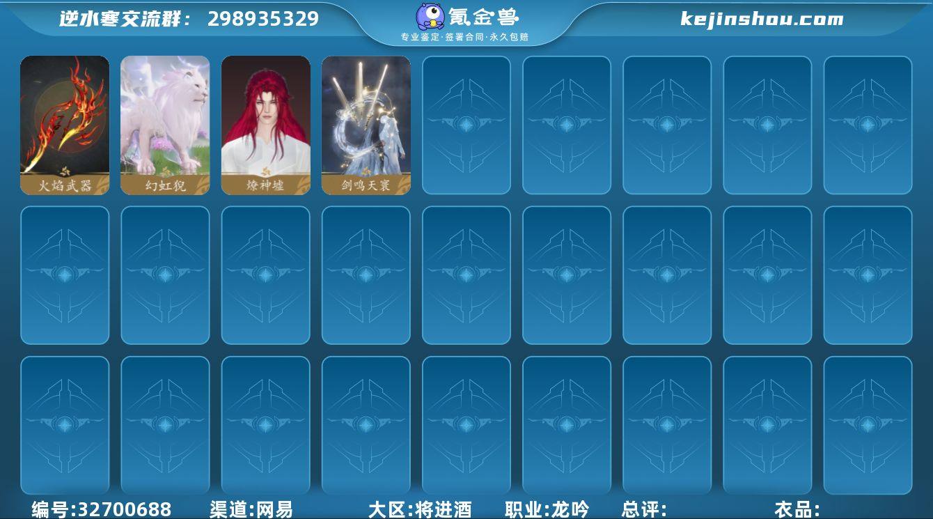 【区服】 武林萌主 【充值称号】 凭栏听雨 【已用天赏石】 6 【天赏发型】 燎神墟 【天赏祥瑞】 幻虹猊 【天赏外观】 火焰武器, 剑鸣天寰 【副本外观】 白夜拂雪*3, 霜途无间, 飞焰流波, 紫宿宸极, 星剑分野 【配饰】 流梦比翼 【商城外观】 蕉雨夜澜, 纯白月光, 逸夏浮澜, 时隙旅者, 司玄镇天, 千星咏叹, 跃动心芒, 云腾游雾, 灵语星彩, 凤亭骁野, 晴岸涛吟, 云汉逢夕, 不负卿愿, 帝皇铠甲, 鳞骨逢幽, 贪狼摄星, 衣香鬓影, 逆鳞浊日 【祥瑞坐骑】 云螭·金玉纳福, 布丁, 云螭·庆舞迎春, 假面, 云螭·再浪一夏, 风行·江湖景, 云螭·封冰怀雪, 风行·世间情, 云螭·燃烛续昼, 风行·万灯明, 龙衔瑞焰, 金冠鼠鼠, 纵风甲车·玄, 纵风甲车·赤, 粉黛娇, 幻琉晶, 狂霸天, 秋霜橘, 星河转·银昼, 星河转·金夕, 星河转·赤夜, 骋风叱焰, 抟乌镇妖, 伯力, 咩郎, 霸霸, 墨流云·玄色, 墨流云·朱红, 墨流云·靛青, 奔虹赤, 玉霄飞练, 犬威哮月·沧, 花花团子, 绒绒夜, 隐云涧, 空山闲, 犬威哮月 【武器环身】 剑渡东海, 沧渊冥息 【灵韵内功】 汲川, 破戟, 熔甲, 梵铃诀 【铜币数量】 13424