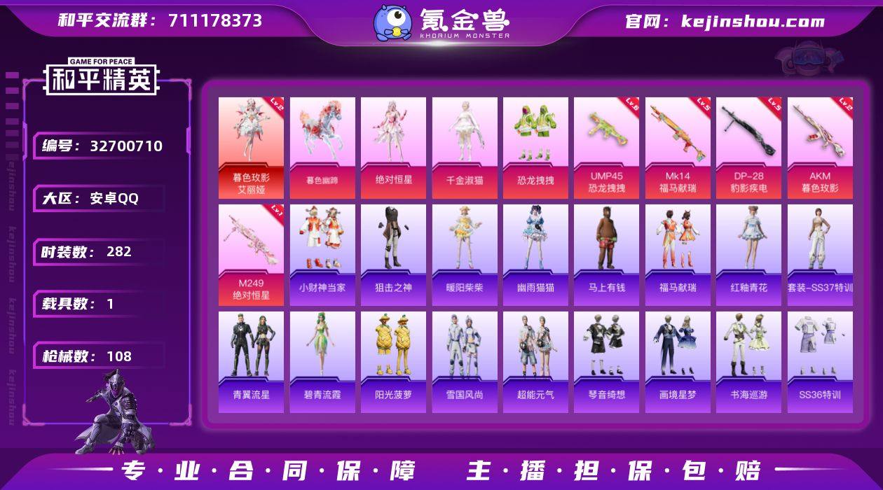 漂亮公主衣柜号/【2级艾丽娅/千金淑猫/小番茄】绝对恒星/恐龙拽拽/满级mk14/2级ak暮色魅影/全套艾丽娅 实名: 可修改 时装数: 282 载具数: 1 枪械数: 108 战备数: 88 神级装扮: 暮色玫影-艾丽娅 热门装扮: 恐龙拽拽,千金淑猫,绝对恒星 载具: 暮色幽蹄 稀有枪皮: UMP45恐龙拽拽,DP-28-豹影疾电,M249-绝对恒星,AKM-暮色玫影