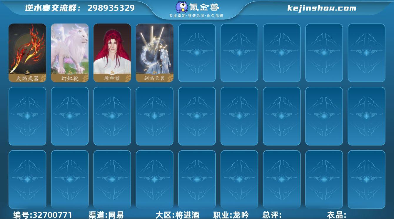 【区服】 武林萌主 【充值称号】 凭栏听雨 【已用天赏石】 6 【天赏发型】 燎神墟 【天赏祥瑞】 幻虹猊 【天赏外观】 火焰武器, 剑鸣天寰 【副本外观】 白夜拂雪*3, 霜途无间, 飞焰流波, 紫宿宸极, 星剑分野 【配饰】 流梦比翼 【商城外观】 蕉雨夜澜, 纯白月光, 逸夏浮澜, 时隙旅者, 司玄镇天, 千星咏叹, 跃动心芒, 云腾游雾, 灵语星彩, 凤亭骁野, 晴岸涛吟, 云汉逢夕, 不负卿愿, 帝皇铠甲, 鳞骨逢幽, 贪狼摄星, 衣香鬓影, 逆鳞浊日 【祥瑞坐骑】 云螭·金玉纳福, 布丁, 云螭·庆舞迎春, 假面, 云螭·再浪一夏, 风行·江湖景, 云螭·封冰怀雪, 风行·世间情, 云螭·燃烛续昼, 风行·万灯明, 龙衔瑞焰, 金冠鼠鼠, 纵风甲车·玄, 纵风甲车·赤, 粉黛娇, 幻琉晶, 狂霸天, 秋霜橘, 星河转·银昼, 星河转·金夕, 星河转·赤夜, 骋风叱焰, 抟乌镇妖, 伯力, 咩郎, 霸霸, 墨流云·玄色, 墨流云·朱红, 墨流云·靛青, 奔虹赤, 玉霄飞练, 犬威哮月·沧, 花花团子, 绒绒夜, 隐云涧, 空山闲, 犬威哮月 【武器环身】 剑渡东海, 沧渊冥息 【灵韵内功】 汲川, 破戟, 熔甲, 梵铃诀 【铜币数量】 13424