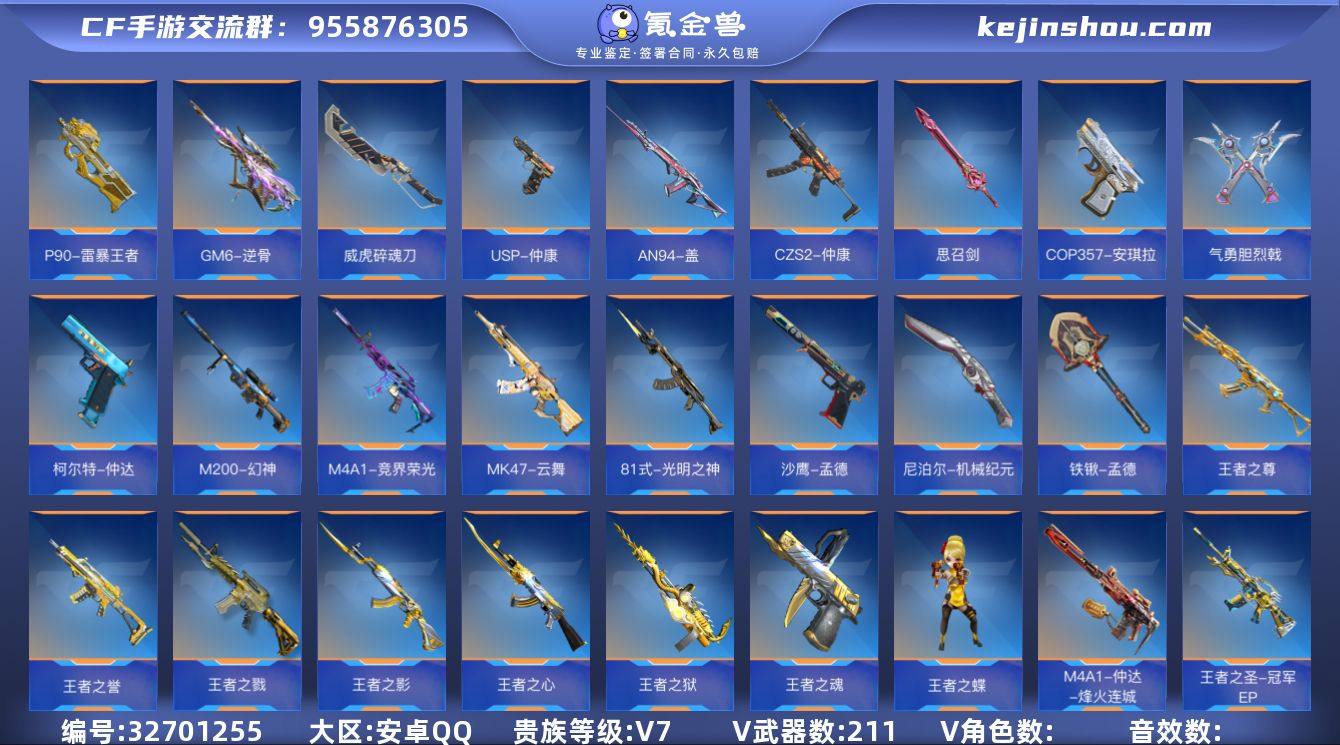 ✨20王者武器+王圣冠军EP+奉先无双 星象四圣兽 仲达烽火连城+COP+游骑兵寒霜+6烈✨『260V-VIP7-等级127』 【王者武器】:/王者之圣-冠军EP/王者之戮/王者之心/王者之影/王者之尊/王者之誉/王者之狱/王者之蝶/P90-雷暴王者/王者之魂/ 【热门武器】:/AK47-奉先-无双/M4A1-星象-璀璨星辰/M4A1-仲达-烽火连城/GM6-逆骨/CZS2-仲康/AN94-盖/M4A1-游骑兵-寒霜/M4A1-竞界荣光/81式-光明之神/MK47-云舞/M200-幻神/寒霜烈龙*6/ 【副武器】:/COP357-安琪拉/COP357-冰川守护/USP-仲康/沙鹰-孟德/柯尔特-仲达/USP-神罚*6/ 【近战】:/屠龙*7/气勇胆烈戟/威虎碎魂刀/思召剑/铁锹-孟德/尼泊尔-机械纪元/ 【角色】:/步练师/祝融夫人/瞳/ 【其他】:/4音效卡(星象)/3消灭音效/狙击枪线-HeartShot/狙击枪线-冰霜/ 截图展示段位不代表实际段位 如赛季更新等不可抗拒因素发生变化、时限道具不保证所剩时间