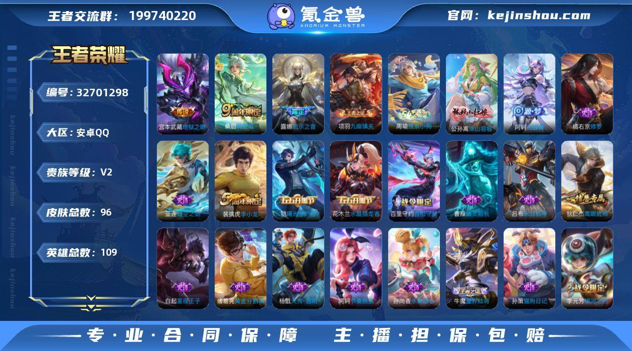 安卓Q-V2-最强王者段位-109英雄-96皮肤-3传说-30史诗 【传说皮肤】:桑启鸣野蒿,露娜启示之音,宫本武藏地狱之眼 【限定皮肤】:姜子牙天穹之誓,狄仁杰阴阳师,嬴政优雅恋人,项羽海滩派对,露娜启示之音,李元芳银河之约,裴擒虎李小龙,沈梦溪龙舞盛年 【赛季限定】:姜子牙天穹之誓,东皇太一噬灭天穹,太乙真人谧流熔炉,钟馗虚灵犬护,甄姬逆浪荇歌,亚瑟荣光之誓,牛魔星界战将,项羽九幽镇关 【战令限定】:李元芳银河之约,亚连破空之剑,孙悟空神迹守卫,百里守约百相守梦,老夫子百相守梦,周瑜线条小狗 【史诗皮肤】:周瑜线条小狗,项羽九幽镇关,公孙离涂山容容,阿轲化蝶舞,牛魔星界战将,百里守约百相守梦,亚连破空之剑,杨戬天秀启明,裴擒虎李小龙,橘右京修罗,李元芳银河之约,狄仁杰鹰眼统帅,伽罗箭羽风息,孙策猫狗日记,阿轲节奏热浪,白起星夜王子,李元芳逐浪之夏,刘禅天才门将,铠曙光守护者,诸葛亮黄金分割率,刘邦德古拉伯爵,花木兰水晶猎龙者,吕布末日机甲,曹操幽灵船长,吕布圣诞狂欢,墨子金属风暴,妲己魅力维加斯,嬴政摇滚巨星,嬴政优雅恋人,孙尚香水果甜心,宫本武藏鬼剑武藏 【其他皮肤】:虞姬溯影追猎,艾琳鹤鸣心笺,亚瑟...