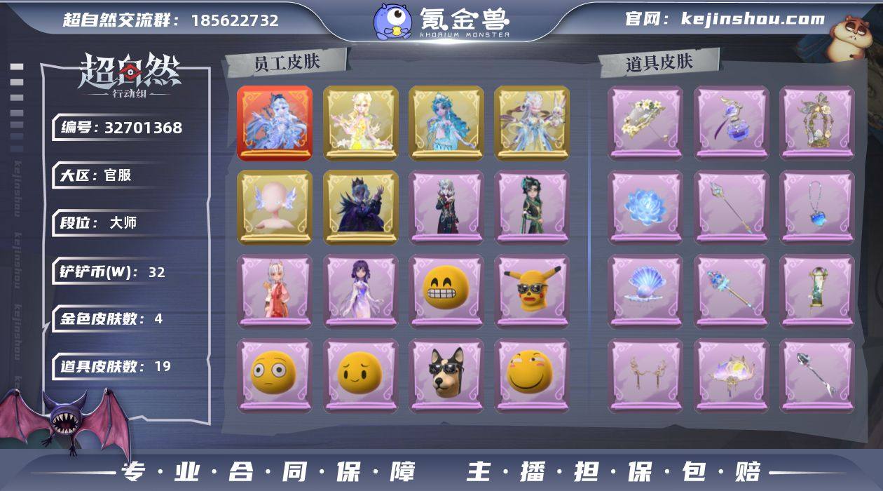 红色皮肤数量: 1 金色皮肤数量: 4 紫色皮肤数量: 5 道具皮肤数量: 19 段位: 大师 外观: 嘻嘻头套,烈焰红唇头套,呆滞头套,卑微头套,哈士奇头套,滑稽头套,鱼头怪头套,面具马头套,萨卡班甲鱼头套,渡鸦公爵,尘封旧事,炽天使的余烬,晚安小熊,瑶台梦,醉花阴,拂云仙,不朽的今夜,沧海之遗,海月息潮,琢玉怀乡,磨砺成锋,织锦云程,听潮祝福,夜浮船,孤独对望,春之声,梵卓之礼
