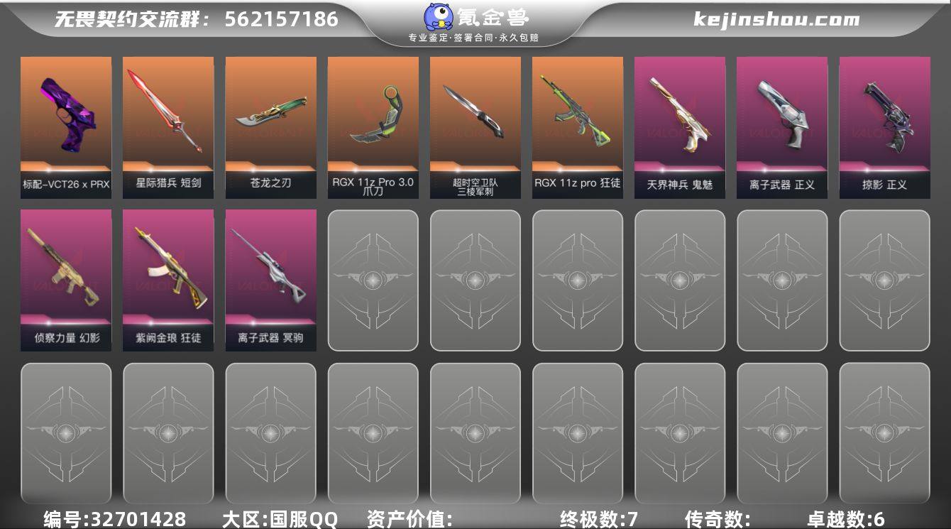 【英雄】:炼狱,维斯,暮蝶,壹决,铁臂,捷风,幽影,不死鸟,贤者,猎枭,零,芮娜,尚勃勒,霓虹,斯凯,夜露,盖可,黑梦 【近战武器】:近战武器-碎心裂刃,近战武器-超时空卫队 三棱军刺,近战武器-5周年//公测重制版 苍龙之刃,近战武器-RGX 11z Pro//3.0 爪刀,近战武器-星际猎兵 短剑 【狂徒】:狂徒-RGX 11z Pro,狂徒-紫阙金琅 【幻影】:幻影-侦察力量 【冥驹】:冥驹-离子武器 【骇灵】:骇灵-无限竞技 【VCT手枪】:标配-VCT26 x PRX 【正义】:正义-掠影,正义-离子武器 【鬼魅】:鬼魅-天界神兵 【卡面】:Clutch 卡面,无畏契约GO!第一卷:芮娜 卡面,无畏契约GO!第一卷:零 卡面,无垠星环 卡面,《双城之战》金克丝 卡面,无畏契约GO!第一卷:贤者 卡面,钢锁vs盖可 卡面,别冒尖 卡面,势不可挡//K/O 卡面,代号红色 卡面,新兵报到 卡面,V契约 卡面,无畏契约 卡面 【喷漆】:买装还是存钱 喷漆,红鳞 喷漆,无畏契约GO!第一卷:零 喷漆,无畏契约GO!第一卷:贤者 喷漆,暴走萝莉 喷漆,松叶 喷漆,无畏契约GO!第一卷:奇乐 喷漆,放下武器 喷漆,胜利属于无畏契约 喷漆,GLHF 喷漆,无畏契约 喷漆 【挂饰】:天外飞客 挂饰,《双城之战》魄罗...