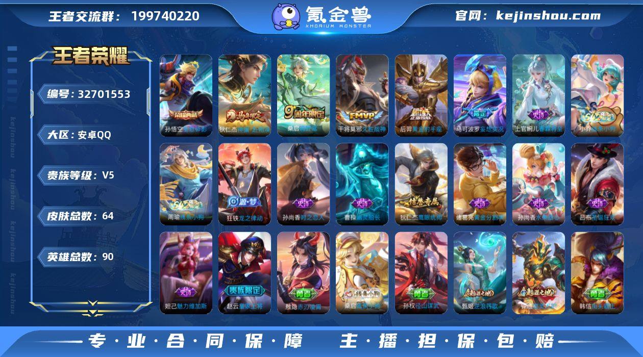 安卓Q-64皮肤-1典藏皮肤-5传说-11史诗 【英雄全皮】:孙权全皮,敖隐全皮 【荣耀典藏】:孙悟空全息碎影 【传说皮肤】:狄仁杰神骥赴朔漠,桑启鸣野蒿,马可波罗妄想实况,干将莫邪久胜战神,后羿黄金射手座 【限定皮肤】:姜子牙天穹之誓,狄仁杰阴阳师,赵云皇家上将,马可波罗妄想实况,项羽海滩派对,艾琳女武神,鬼谷子天穹祈灯,沈梦溪龙舞盛年,刘邦剑破天穹,周瑜熔金海岸 【赛季限定】:鬼谷子天穹祈灯,刘邦剑破天穹,姜子牙天穹之誓,东皇太一噬灭天穹,太乙真人谧流熔炉,钟馗虚灵犬护,甄姬逆浪荇歌 【战令限定】:周瑜线条小狗,小乔线条小狗 【史诗皮肤】:上官婉儿春霖将至,周瑜线条小狗,小乔线条小狗,狂铁龙之律动,孙尚香时之恋人,狄仁杰鹰眼统帅,诸葛亮黄金分割率,曹操幽灵船长,吕布圣诞狂欢,妲己魅力维加斯,孙尚香水果甜心,赵云皇家上将 【其他皮肤】:桑启线条小狗,孙权径山谋武,甄姬逆浪荇歌,钟馗虚灵犬护,太乙真人谧流熔炉,东皇太一噬灭天穹,周瑜熔金海岸,姜子牙天穹之誓,大司命暗都幽影,刘邦剑破天穹,钟无艳春野之旅,沈梦溪龙舞盛年,鬼谷子天穹祈灯,后羿完美运算,沈梦溪鲨炮海盗猫,诸葛亮掌控之力,孙尚香沉稳之力,王昭君...