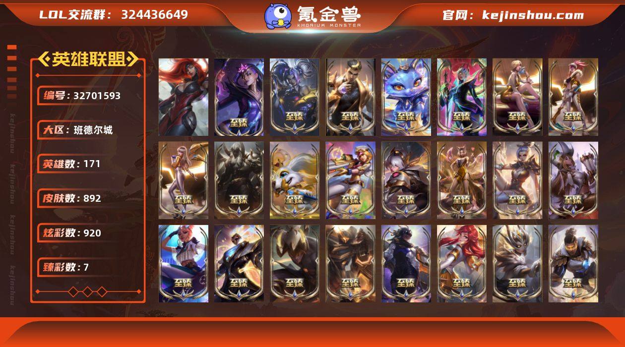 【皇冠号】未定级段位-171英雄-892皮肤-920炫彩-1终极-85神话-112限定-81传说-171史诗 【热门头像】:爱情之歌头像,觅心之翼奎因头像,星守索拉卡头像,永恒之森霞头像 【神话皮肤】:十周年纪念安妮,殿堂传奇乐芙兰,十五周年纪念希维尔,神凰行者瑞羽圣凰艾尼维亚,黎明使者卡尔玛,水晶泰坦诺提勒斯,水晶圣骑塔莉娅,灰烬杀手塞拉斯,灰烬骑士派克 【至臻皮肤】:至臻魔女乐芙兰,至臻至高天凯尔,至臻灵魂莲华易,至臻剪纸仙灵希维尔,至臻星之守护者索拉卡,至臻灵魂莲华提莫,至臻北极星使者沃里克,至臻魅惑女巫厄运小姐,至臻绝息圣堂厄运小姐,至臻征服者贾克斯,至臻魅惑女巫莫甘娜,至臻KDA伊芙琳,至臻西部魔影伊芙琳,至臻斗魂觉醒萨科,至臻玉剑传说琴仙子娑娜,至臻源计划正义艾瑞莉娅,至臻海珀利安小队X09星环灵风迦娜,至臻电玩女神凯特琳,至臻花仙使者卡特琳娜,至臻焰执事布兰德,至臻黑夜使者李青,至臻烈焰美人薇恩,至臻灵能特工伊泽瑞尔,至臻天龙之子伊泽瑞尔,至臻KDA阿卡丽,至臻魔女阿卡丽,至臻王国机神玄武盖伦,至臻战斗学院蕾欧娜,至臻西部魔影猎天使恶魔泰隆,至臻玉剑传说武剑仙锐雯,至臻战斗学院拉克丝,至臻青花瓷拉克丝,至臻KDA...