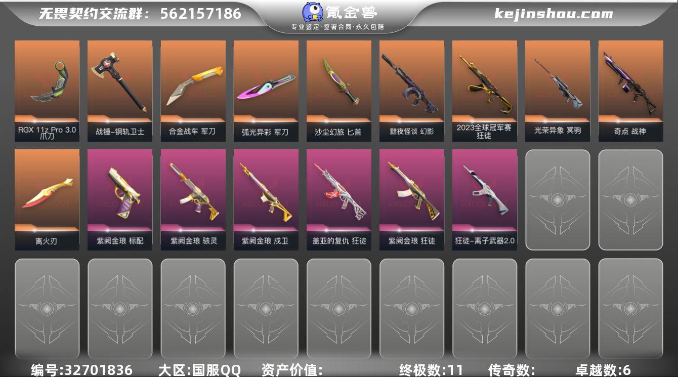 【937808】【套装】:离火刃套装,离火刃套装,紫阙金琅套装 【英雄】:幻棱,炼狱,维斯,暮蝶,壹决,铁臂,捷风,雷兹,幽影,不死鸟,贤者,猎枭,蝰蛇,零,芮娜,奇乐,尚勃勒,霓虹,斯凯,夜露,星礈,K/O,盖可,黑梦,钢锁 【近战武器】:近战武器-RGX 11z Pro//3.0 爪刀,近战武器-离火刃,近战武器-钢轨卫士 战锤,近战武器-合金战车 军刀,近战武器-弧光异彩 军刀,近战武器-金琅斧,近战武器-沙尘幻旅 匕首 【狂徒】:狂徒-2023全球冠军赛,狂徒-盖亚的复仇,狂徒-紫阙金琅,狂徒-离子武器//2.0,狂徒-钢轨卫士,狂徒-弧光异彩,狂徒-沙尘幻旅 【幻影】:幻影-黯夜怪谈,幻影-合金战车,幻影-噬源兽防卫工程,幻影-战术小伙伴 【戍卫】:戍卫-紫阙金琅,戍卫-钢轨卫士,戍卫-彩梦之城,戍卫-花漾粉红,戍卫-萌彩剪影 【獠犬】:獠犬-弧光异彩,獠犬-胡桃狂想,獠犬-数码咒术,獠犬-战术小伙伴 【冥驹】:冥驹-光荣异象,冥驹-胡桃狂想,冥驹-花漾粉红 【飞将】:飞将-合金战车,飞将-沙尘幻旅,飞将-信手涂鸦,飞将-光导纤维 【战神】:战神-奇点,战神-萌彩剪影,战神-数码咒术 【奥丁】:奥丁-信手涂鸦,奥丁-战术小伙伴 【判官】:判官-萌彩剪影,判官-数码...