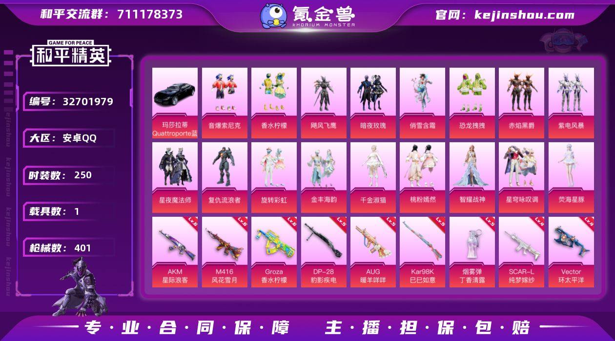 安卓 手Q-18粉装-16特效枪-1载具-12粉色飞行器-144702热力值-21王牌印记-250套装-401枪皮 【热门品类】:粉装-音爆索尼克,套装-小丑鱼,角色-军刀雅典娜,套装-龟仙人,套装-粉红小猪,角色-8号机,角色-Mark.06 【粉色套装】:粉装-香水柠檬,粉装-飓风飞鹰,粉装-暗夜玫瑰,粉装-俏雪含霜,粉装-恐龙拽拽,粉装-赤焰黑爵,粉装-紫电风暴,粉装-星夜魔法师,角色-复仇流浪者,粉装-旋转彩虹,粉装-音爆索尼克,粉装-金丰海韵,角色-千金淑猫,粉装-桃粉嫣然,角色-智耀战神,粉装-星穹咏叹调,角色-荧海星豚,角色-罪夜之冕 【粉色枪皮等级】:AKM-星际浪客(六级),SCAR-L-纯梦嫁纱(四级),M416-风花雪月(六级),M416-墨龙九天(三级),GROZA-香水柠檬(六级),AUG-暖羊咩咩(五级),UMP45-恐龙拽拽(三级),UMP45-宇宙意志(三级),Vector-环太平洋(四级),Kar98K-巳巳如意(五级),SKS-碧影闪光(四级),Mk14-精灵梦叶罗丽(四级),Mk14-福马献瑞(四级),SPAS-12-音爆索尼克(三级),DP-28-豹影疾电(五级),烟雾弹-丁香清露(五级) 【粉色载具】:玛莎拉蒂Quattroporte(夜幕蓝) 【粉色枪皮】:AKM-星际浪客,SCAR-L-纯梦嫁纱,M416-风花雪月,M416-墨龙九天,GROZA-香水柠檬,AUG-...