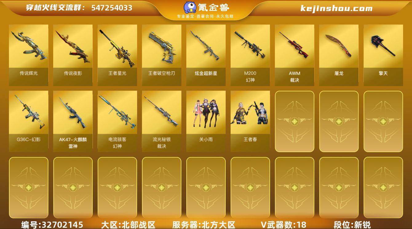 【941106】北方大区-21V-2王者武器数-1炫金武器数 【传说武器】:传说辉光,传说夜影*2 【热门武器】:传说夜影*2,传说辉光,G36C-幻影,M200-幻神 【王者炫金武器】:王者星光,王者破空枪刃,炫金超新星 【音效卡】:QBZ03-金色蔷薇音效卡 【皮肤】:幻神-电流骇客 皮肤,裁决-流光秘银,火麒麟-雷神 【角色】:关小雨,王者春 【人偶武器】:COP-旗袍,深渊终结者手雷 【挑战大师】:神圣爆裂者-末日III 【英雄级武器】:G36C-幻影,AWM-裁决,M200-幻神,屠龙*3,擎天,高爆手雷-神工天巧*2,闪光弹-神工天巧*2,烟雾弹-神工天巧*2 【道具】:绿色巨人,灵魂忍者,迷雾幽灵,夺命之镰,防化服*2,防弹头盔*2,防弹衣*2,C4工具钳*2,手雷包*2 【特殊枪械】: