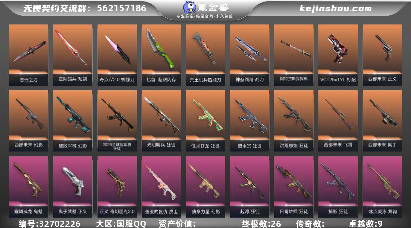 【938224】【套装】:无畏契约季前邀请赛套装,西部未来套装 【英雄】:幻棱,炼狱,维斯,暮蝶,钛狐,壹决,铁臂,捷风,雷兹,幽影,不死鸟,贤者,猎枭,蝰蛇,零,芮娜,奇乐,尚勃勒,霓虹,斯凯,夜露,星礈,K/O,海神,盖可,黑梦,钢锁 【近战武器】:近战武器-无畏契约季前邀请赛 悲悯之刃,近战武器-影钩,近战武器-奇点//2.0 蝴蝶刀,近战武器-紫金爪刀,近战武器-威龙之刃,近战武器-鬼丸国纲,近战武器-未来开拓者,近战武器-超限闪存 匕首,近战武器-荒土机兵 热能刀,近战武器-天御刀,近战武器-夜刃诡镰,近战武器-神圣领域 战刀,近战武器-阿特拉斯指挥部 甩棍,近战武器-星际猎兵 短剑 【狂徒】:狂徒-2025全球冠军赛,狂徒-光明哨兵,狂徒-洪荒怒焰,狂徒-塑水宗,狂徒-偃月苍龙,狂徒-掠影,狂徒-起源,狂徒-日冕雄师,狂徒-荒土机兵 【幻影】:幻影-破败军械,幻影-西部未来,幻影-侦察力量,幻影-超限闪存,幻影-神圣领域,幻影-纳米打击,幻影-西部未来 【戍卫】:戍卫-盖亚的复仇,戍卫-浮光跃金,戍卫-逆冲蛮牛,戍卫-月球哨兵 【獠犬】:獠犬-神圣领域,獠犬-模拟赫兹,獠犬-逆冲蛮牛 【冥驹】:冥驹-冰点凝冻,冥驹-荒土机兵,冥驹-模拟赫兹,冥...