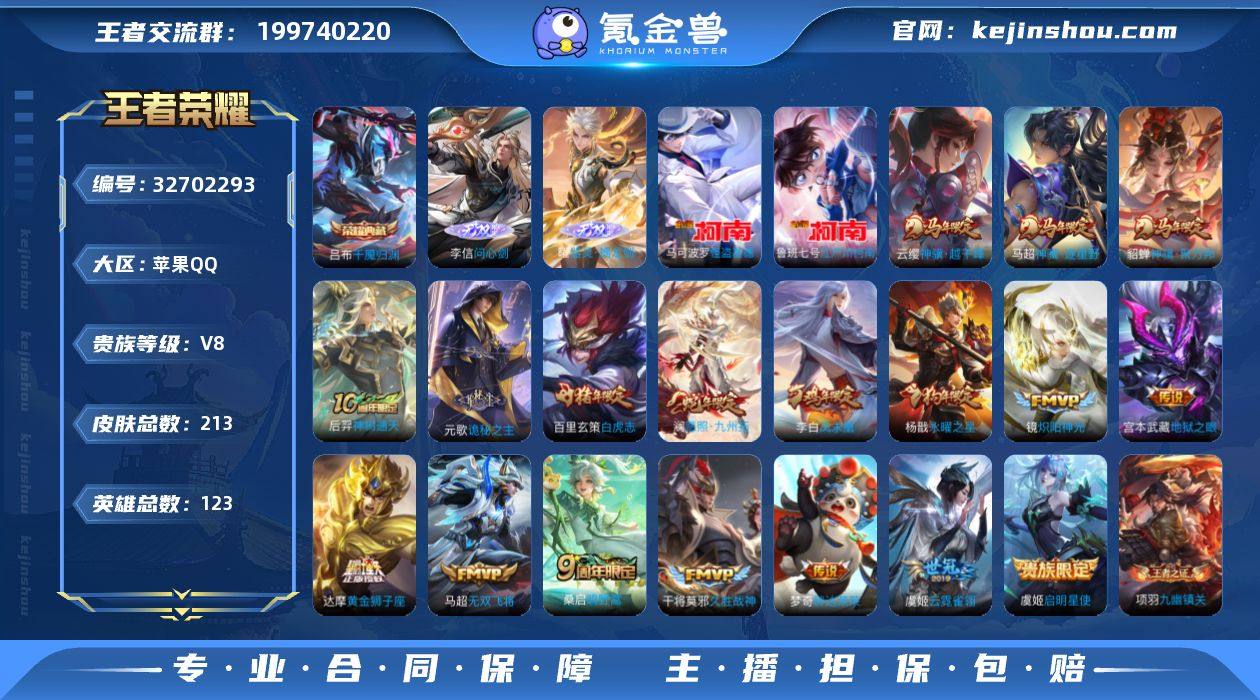 【王者荣耀】珍品无双0 典藏1 无双2 珍品传说3 传说18 史诗66 英雄123 皮肤213 贵族8级 荣耀典藏:千魇归渊__无双皮肤:器灵·螭龙剑|问心剑__珍品传说:江户川柯南|怪盗基德|孙策-时之奇旅__传说皮肤:鸣野蒿|无双飞将|炽阳神光|启明星使|胖达荣荣|地狱之眼|云霓雀翎|久胜战神|黄金狮子座|白虎志|凤求凰|永曜之星|愿照·九州拓|诡秘之主|神树通天|神骥·越千峰|神骥·逐星野|神骥·聚万邦__稀有限定:至尊宝|引擎之心|蔷薇恋人|神威|傲雪梅枪|百解令|大漠名商|地狱燃心|古海寻踪|海滩派对|海盐诗旅|航海奇遇记|幻夜卜梦|皇家上将|剑破天穹|江河有灵|魔术师|擒涛扼浪|燃音魔法|沙漠行僧|探海日志|天穹祈灯|玩趣恶龙|无心|五谷丰年|纤云弄巧|星界游侠|阴阳师|原初追逐者|云间偶戏|暗隐猎兽者|暗渊魔法|冰冠公主|乘风破浪|大乔-猫狗日记|德古拉伯爵|地狱岩魂|功夫厨神|鬼剑武藏|节奏热浪|金属风暴|吕布-末日机甲|魅力维加斯|女仆咖啡|偶像歌手|青蛇|赏金猎手|圣诞狂欢|圣诞恋歌|水果甜心|水晶猎龙者|天秀·启明|赵云-未来纪元|星夜王子|鹰眼统帅|幽灵船长|逐浪之夏|紫霞仙子|百里守约-百相守梦|老夫子-百相守梦|谪仙醉月|噬灭天穹|敬我三分|破空之剑|埋骨钱|天穹之誓|修罗|曙光守护者|千年...