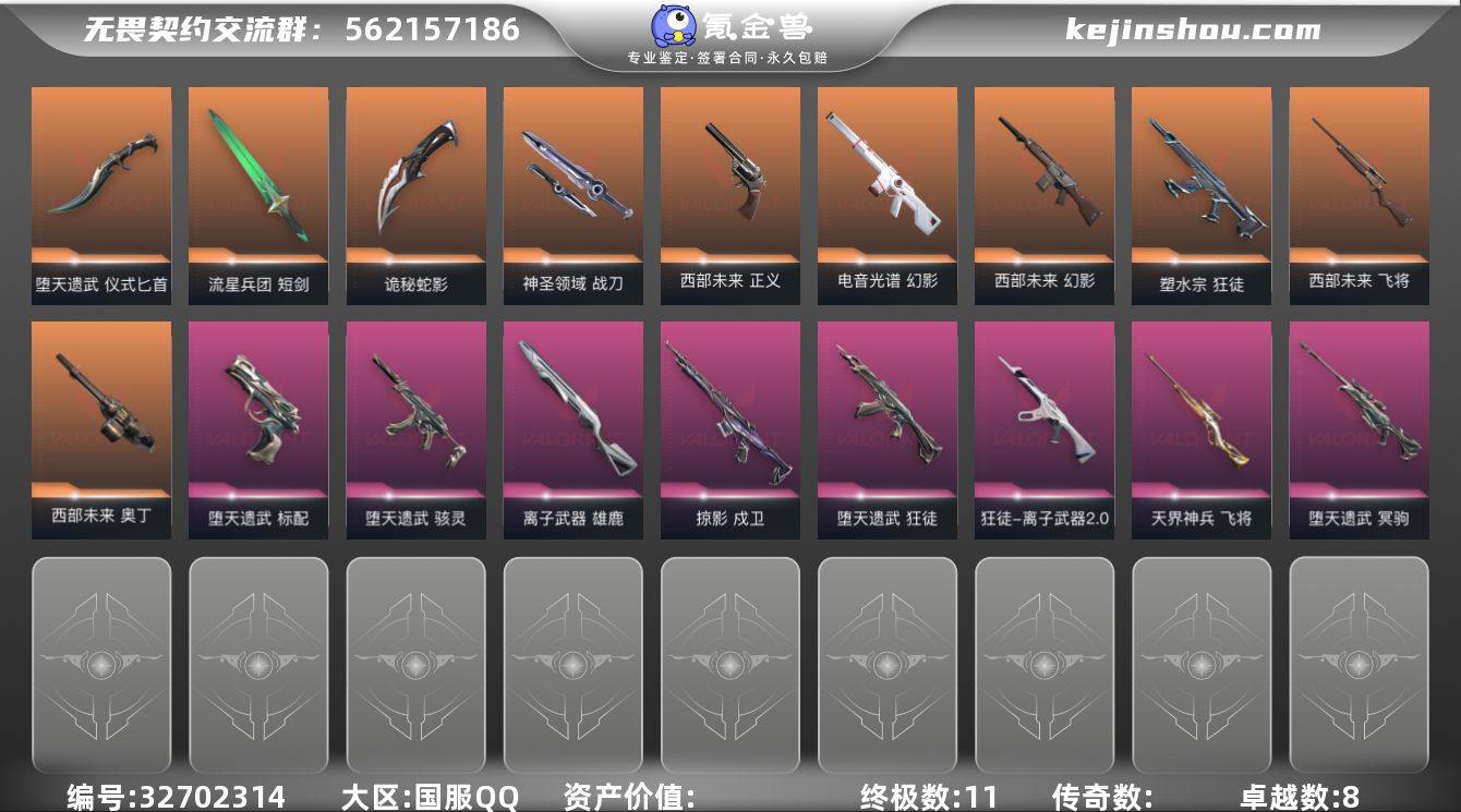 【套装】:西部未来套装,堕天遗武套装 【英雄】:幻棱,炼狱,维斯,暮蝶,钛狐,壹决,铁臂,捷风,雷兹,幽影,不死鸟,贤者,猎枭,蝰蛇,零,芮娜,奇乐,尚勃勒,霓虹,斯凯,夜露,星礈,K/O,海神,盖可,黑梦,钢锁 【近战武器】:近战武器-未来开拓者,近战武器-流星兵团 短剑,近战武器-堕天遗武 仪式匕首,近战武器-诡秘蛇影 军刀,近战武器-神圣领域 战刀 【狂徒】:狂徒-塑水宗,狂徒-堕天遗武,狂徒-离子武器//2.0,狂徒-流星兵团,狂徒-诡秘蛇影 【幻影】:幻影-西部未来,幻影-电音光谱,幻影-神圣领域,幻影-末日之翼,幻影-西部未来,幻影-电音光谱 【戍卫】:戍卫-掠影,戍卫-战术熊与伙伴们,戍卫-月球哨兵,戍卫-折光棱晶 【獠犬】:獠犬-神圣领域 【冥驹】:冥驹-堕天遗武,冥驹-星云暗涌 【飞将】:飞将-西部未来,飞将-天界神兵,飞将-战术熊与伙伴们,飞将-末日之翼 【莽侠】:莽侠-诡秘蛇影,莽侠-纤云弄巧,莽侠-月球哨兵 【战神】:战神-神圣领域 【奥丁】:奥丁-西部未来,奥丁-流星兵团,奥丁-末日之翼 【判官】:判官-诡秘蛇影 【雄鹿】:雄鹿-离子武器,雄鹿-月球哨兵 【骇灵】:骇灵-堕天遗武,骇灵-流星兵团,骇灵-星云暗涌 【蜂刺】:蜂...