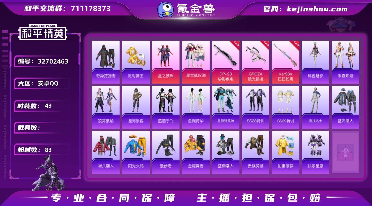 【kyhp1259】安卓 手Q-2粉装-6特效枪-0载具-1粉色飞行器-23029热力值-1王牌印记-43套装-83枪皮 【热门品类】:套装-派对舞王,套装-奇异狩猎者,套装-星河浪客 【粉色套装】:粉装-星之彼岸,粉装-星穹咏叹调 【粉色枪皮等级】:GROZA-镜光银凌(五级),ACE32-萌骑漫游(四级),AKS-74U-森灵之息(五级),Kar98K-巳巳如意(五级),Mk14-福马献瑞(五级),DP-28-豹影疾电(五级) 【粉色枪皮】:GROZA-镜光银凌,ACE32-萌骑漫游,AKS-74U-森灵之息,Kar98K-巳巳如意,Mk14-福马献瑞,DP-28-豹影疾电 【粉色飞行器】:炫彩糖果飞行器 【粉色降落伞】:炫彩糖果降落伞 【稀有套装】:套装-炫彩糖果,角色-阿虎,套装-马上有钱,套装-燕燕于飞,套装-鱼渊荷华,套装-星影赞美诗,套装-朱霞炽焰,套装-凌霄紫焰,角色-绯色魅影,套装-雨过天青,套装-红釉青花 【稀有枪皮】:AUG-冰晶雪宝,AKM-破晓战魂,AKM-龙的传人,SCAR-L-夜灯,SCAR-L-炫彩节奏,SCAR-L-玉兔迎春,M416-蓝色火焰,AUG-耀粉歌者,AUG-月影灵韵,M762-天降萌叽,M762-奇异狩猎者,ARX-凌霄紫焰,UZI-月影灵韵,UMP45-夜灯,UMP45-蓝色火焰,汤姆逊-天降萌叽,汤姆逊-奇异狩猎者,汤姆逊-像素花束,JS9-凌霄紫焰,M24-...
