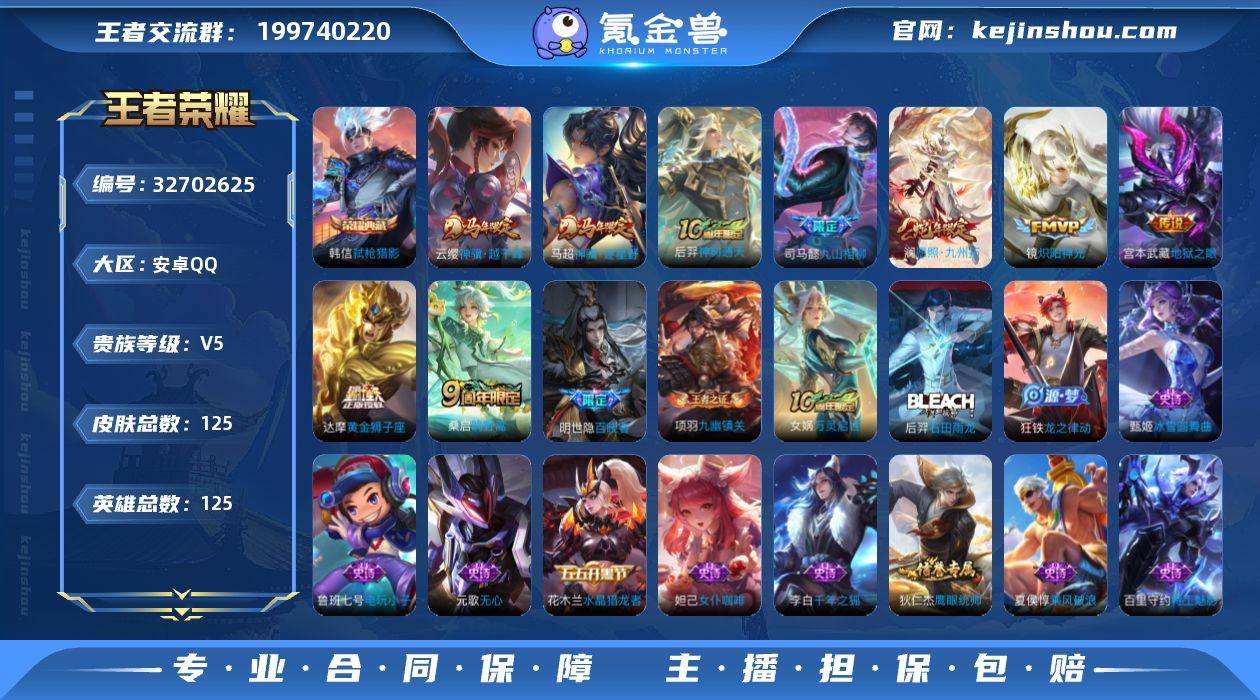 【王者荣耀】珍品无双0 典藏1 无双0 珍品传说0 传说9 史诗36 英雄125 皮肤125 贵族5级 荣耀典藏:弑枪猎影__传说皮肤:鸣野蒿|炽阳神光|地狱之眼|黄金狮子座|愿照·九州拓|九山相柳|神树通天|神骥·越千峰|神骥·逐星野__稀有限定:海滩派对|皇家上将|剑破天穹|镜-真我赫兹|天穹祈灯|无心|阴阳师|优雅恋人|原初追逐者|暗隐猎兽者|缤纷独角兽|冰雪圆舞曲|乘风破浪|大乔-猫狗日记|地狱岩魂|电玩小子|功夫厨神|鬼剑武藏|吕布-末日机甲|魅力维加斯|女仆咖啡|水果甜心|水晶猎龙者|孙策-猫狗日记|天才门将|赵云-未来纪元|鹰眼统帅|逐浪之夏|噬灭天穹|敬我三分|顽岩魄|天穹之誓|千年之狐|舞动绿茵|特工魅影|星界战将|谧流熔炉|龙之律动|布丁狗之约|虚灵犬护|石田雨龙|逆浪荇歌|黄忠-百相守梦|荣光之誓|万灵启世|鹤鸣心笺|九幽镇关|小乔-线条小狗|周瑜-线条小狗|百晓客__优质皮肤:年年有余|激情绿茵|海之征途|冰刃幻境|隐刃|占星师|魇语军师|灼热之刃|帝国元帅|战争女神|万圣前夜|破阵·退雄兵|潮玩探月行|秘密基地|次元突破|丁香结|阿尔法小队|死亡骑士|黄金武士|少女阿狸|忍·炎影|街头霸王|教廷特使|漠中幻影|西部游侠|潮玩造梦师|紫罗兰之誓|拳王|时尚教父|救世之瞳|白执事|西施-雪境奇遇|...