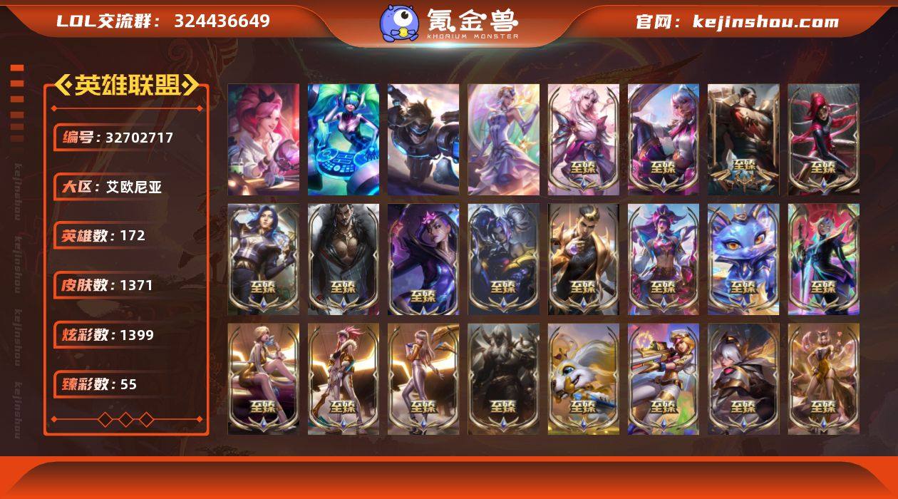 未定级段位-172英雄-1371皮肤-1399炫彩-6终极-140神话-223限定-116传说-214史诗 【珍稀头像】:雪花头像,星守阿狸头像,至爱的鹿头像 【热门头像】:爱情之歌头像,觅心之翼奎因头像,觅心游侠卢锡安头像,爱情鸽头像,KDA阿卡丽头像,源计划刀妹头像,星守索拉卡头像 【神话皮肤】:十周年纪念安妮,源代码乐芙兰,殿堂传奇乐芙兰,十五周年纪念希维尔,新卧虎藏龙贾克斯,暗星科加斯,神凰行者瑞羽圣凰艾尼维亚,黎明使者卡尔玛,殿堂传奇薇恩,灰烬征服者潘森,灰烬骑士莫德凯撒,水晶圣骑蕾欧娜,灰烬守护者慎,水晶巫灵泽拉斯,水晶泰坦诺提勒斯,水晶掠夺者卡兹克,星之守护者塔莉垭,水晶圣骑塔莉娅,灰烬杀手塞拉斯 【至臻皮肤】:至臻魔女乐芙兰,至臻至高天凯尔,至臻灵魂莲华易,至臻剪纸仙灵希维尔,至臻星之守护者索拉卡,至臻灵魂莲华提莫,至臻北极星使者沃里克,至臻魅惑女巫厄运小姐,至臻魅惑女巫厄运小姐(2022),至臻绝息圣堂厄运小姐,至臻征服者贾克斯,至臻魅惑女巫莫甘娜,至臻蒙面女郎莫甘娜,至臻KDA伊芙琳,至臻西部魔影伊芙琳,至臻斗魂觉醒萨科,至臻玉剑传说琴仙子娑娜,至臻源计划正义艾瑞莉娅,至臻源计划:正义艾瑞莉娅(2022),至臻海珀利安...