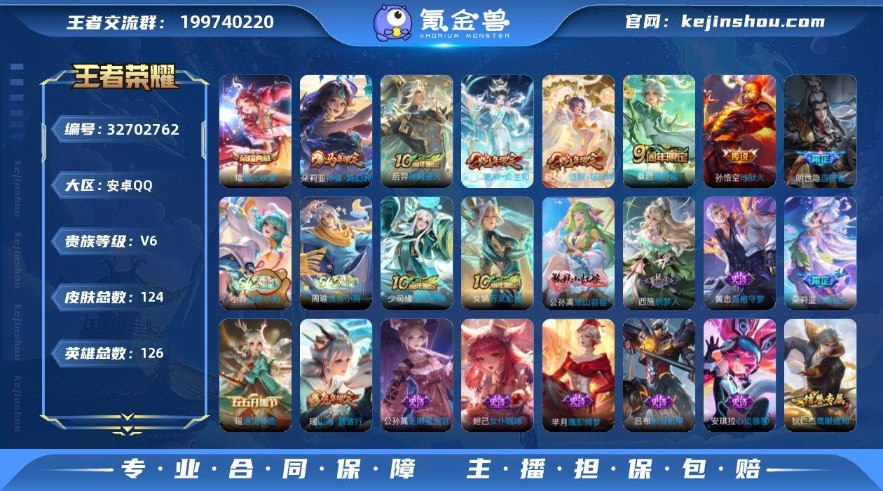 安卓Q-V6-永恒钻石I段位-126英雄-124皮肤-1典藏皮肤-6传说-33史诗 【英雄全皮】:孙权全皮 【荣耀典藏】:瑶拾光映像 【传说皮肤】:朵莉亚神骥鸣幻洲,后羿神树通天,妲己愿照众生和,蔡文姬愿照福禄聚,桑启鸣野蒿,孙悟空地狱火 【限定皮肤】:蒙犽顽岩魄,姜子牙天穹之誓,狄仁杰阴阳师,赵云皇家上将,孙尚香蔷薇恋人,狄仁杰魔术师,项羽海滩派对,瑶山海碧波行,妲己灵卜魔法,鬼谷子天穹祈灯,刘邦剑破天穹,周瑜熔金海岸 【年限皮肤】:瑶山海碧波行,妲己愿照众生和,蔡文姬愿照福禄聚 【赛季限定】:鬼谷子天穹祈灯,刘邦剑破天穹,姜子牙天穹之誓,东皇太一噬灭天穹,太乙真人谧流熔炉,钟馗虚灵犬护,甄姬逆浪荇歌,亚瑟荣光之誓 【战令限定】:妲己灵卜魔法,孙膑茶境仙,马超访茗客,周瑜线条小狗,小乔线条小狗 【史诗皮肤】:明世隐百晓客,周瑜线条小狗,小乔线条小狗,少司缘巫礼祀神,女娲万灵启世,公孙离涂山容容,西施织梦人,朵莉亚幻珠鲛人,黄忠百相守梦,芈月瑰影绮梦,孙膑茶境仙,蒙犽顽岩魄,妲己灵卜魔法,瑶山海碧波行,貂蝉唤灵魅影,瑶遇见神鹿,公孙离无限星赏官,狄仁杰鹰眼统帅,孙策猫狗日记,李元芳逐浪之夏,蔡文姬舞动绿茵,安琪拉...