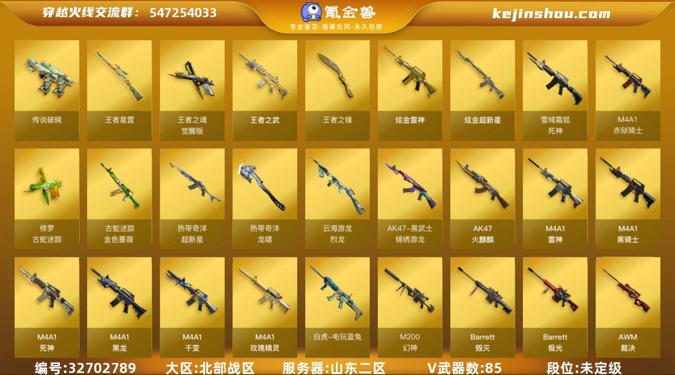 山东二区-91V-9王者武器数-3炫金武器数 【传说武器】:传说破晓 【热门武器】:传说破晓,QBZ03-金色蔷薇,M200-幻神,金色蔷薇-古蛇迷踪,修罗-古蛇迷踪,白虎-电玩蓝兔,M4A1-黑骑士,汤姆逊-烈龙*2,沙鹰-修罗 【王者炫金武器】:王者之武,王者青龙,王者星霆,王者之锋,王者冰锋,炫金雷神,炫金武士,炫金超新星 【音效卡】:M4A1-黑骑士音效卡,M4A1-苍鸣雷神音效卡,Barrett-碧霄极光音效卡,炼狱-百战金芒-庆典舞曲音效卡,死神-雪域霜狐-怀旧音效卡 【皮肤】:幻神-丹凤,金色蔷薇-电竞之星 皮肤,裁决-流光秘银,裁决-羽掣 皮肤,雷神-源计划2.0专属 皮肤,雷神-化蛇 皮肤,M4A1-再燃火线,雷神-神秘按键 皮肤,毁灭-百城浙江 皮肤,毁灭-英雄计划 皮肤,M4A1-黑龙-361,黑骑士-破界 皮肤,黑武士-典韦皮肤,烈火-熔核皮肤,战神-粉色甜心皮肤*2,战神-紫绶金章皮肤*10,战神-流金岁月皮肤*3,极光-能量核心,轻型军用手斧-再燃火线,擎天-梅雀衔霜 皮肤,麒麟刺-甜蜜糖果 皮肤 【角色】:葵,樱,玄豹,零·纪元,雪域霜狐,蛇隐宗,奇洋探员,云海玲珑,葵-阿尔法武装,幻面灵狐,空,暗夜-X,北极狐-X,电竞少女,芳心审判者,飞虎队-X,疾风,0号玩家,灵狐者-...