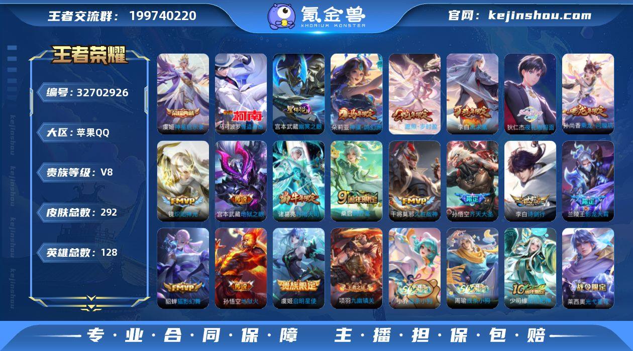 CHC20966,1金标,2银标/怪盗基德/至尊宝/1星元/7按键,苹果Q-V8-最强王者段位-128英雄-292皮肤-1典藏皮肤-1珍品传说-16传说-78史诗 【英雄全皮】:孙权全皮,敖隐全皮,空空儿全皮 【荣耀典藏】:虞姬神鉴启示录 【珍品传说】:马可波罗怪盗基德 【传说皮肤】:朵莉亚神骥鸣幻洲,虞姬愿照岁时盈,桑启鸣野蒿,孙尚香乘龙问璇玑,狄仁杰夜礼服假面,兰陵王影龙天霄,孙悟空齐天大圣,李白诗剑行,诸葛亮时雨天司,镜炽阳神光,虞姬启明星使,貂蝉猫影幻舞,干将莫邪久胜战神,李白凤求凰,宫本武藏地狱之眼,孙悟空地狱火 【限定皮肤】:大乔绒语心约,姜子牙天穹之誓,杨戬破阵退雄兵,狄仁杰阴阳师,赵云皇家上将,墨子降魔,嬴政优雅恋人,元歌云间偶戏,狄仁杰魔术师,项羽海滩派对,兰陵王影龙天霄,花木兰瑞麟志,孙悟空至尊宝,孙悟空孙行者,孙悟空齐天大圣,后羿辉光之辰,李元芳匿光侦查者,李元芳云中旅人,虞姬启明星使,钟馗神迹守卫,蔡文姬繁星吟游,太乙真人华丽摇滚,诸葛亮时雨天司,百里玄策原初追逐者,梦奇顽趣,公孙离玉兔公主,裴擒虎李小龙,裴擒虎擒涛扼浪,云中君纤云弄巧,上官婉儿梁祝,嫦娥拒霜思,嫦娥暖冬兔眠,西施玲珑珍味,蒙犽狂想玩偶喵...