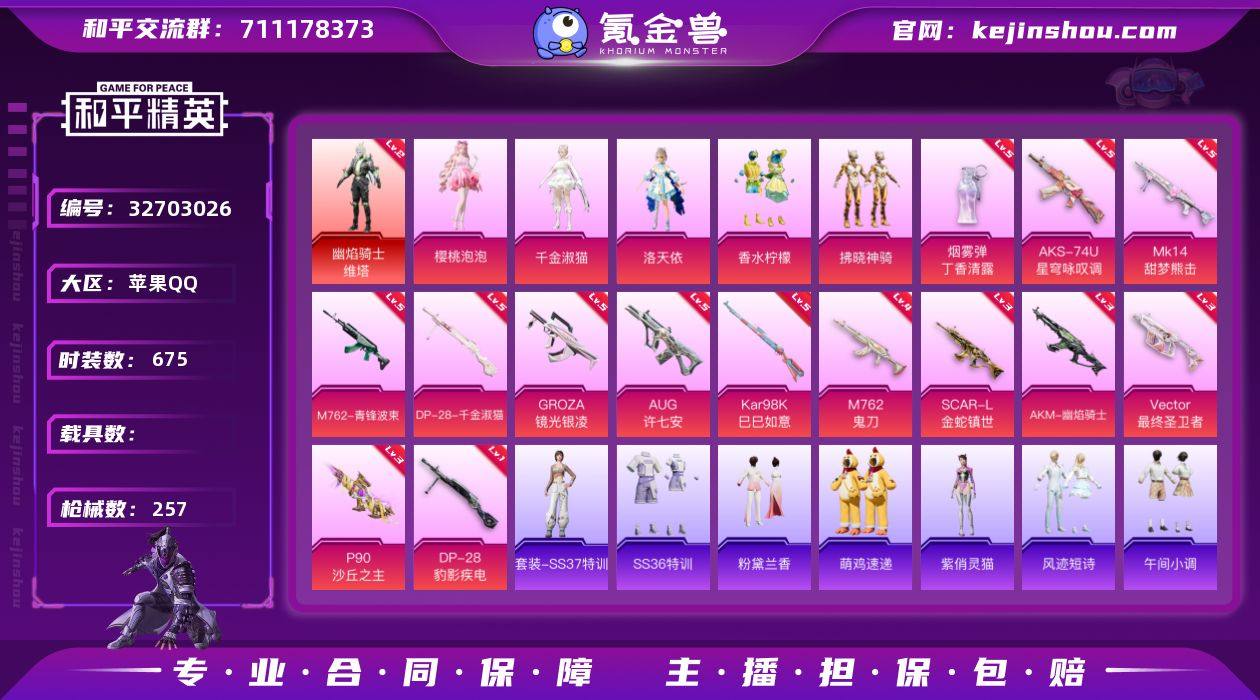 实名: 不可修改 时装数: 675 枪械数: 257 战备数: 203 神级装扮: 幽焰骑士-维塔  热门装扮: 香水柠檬,洛天依,拂晓神骑,千金淑猫,樱桃泡泡 稀有枪皮: P90沙丘之主,M762-青锋波束,AKM-幽焰骑士,DP-28-千金淑猫,GROZA-镜光银凌,AUG-许七安,Kar98K-巳巳如意,SCAR-L金蛇镇世,M762-鬼刀,烟雾弹-丁香清露,AKS-74U-星穹咏叹调,MK14-甜梦熊击,Vector-最终圣卫者,DP-28-豹影疾电