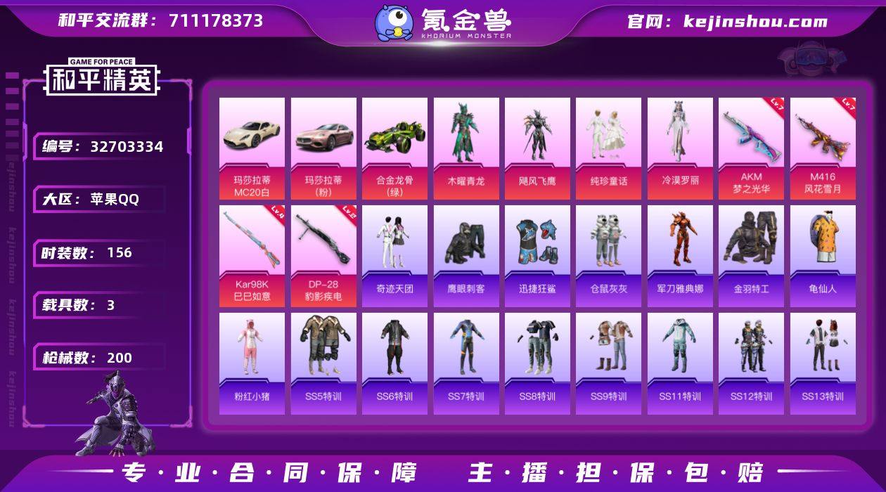 苹果 手Q-4粉装-6特效枪-3载具-1粉色飞行器-65352热力值-14王牌印记-156套装-200枪皮HZ2632502 【热门品类】:角色-军刀雅典娜,套装-金羽特工,套装-龟仙人,套装-粉红小猪 【粉色套装】:粉装-木曜青龙,粉装-飓风飞鹰,粉装-纯珍童话,角色-冷漠罗丽 【粉色枪皮等级】:AKM-梦之光华(七级),M416-风花雪月(七级),UMP45-萌骑冒险(五级),Kar98K-巳巳如意(四级),Mk14-福马献瑞(四级),DP-28-豹影疾电(二级) 【粉色载具】:玛莎拉蒂MC20(星石白),玛莎拉蒂Ghibli(粉),合金龙骨(绿) 【粉色枪皮】:AKM-梦之光华,M416-风花雪月,UMP45-萌骑冒险,Kar98K-巳巳如意,Mk14-福马献瑞,DP-28-豹影疾电 【粉色飞行器】:全功率超战飞行器 【粉色降落伞】:伏魔团降落伞,星之彼岸降落伞,恐龙拽拽降落伞,仲夏莫吉托降落伞,飒粉甜心降落伞 【稀有套装】:套装-龟仙人,角色-罗莉,角色-幸运青,角色-月烬之祷,套装-雨过天青,套装-红釉青花 【稀有枪皮】:AKM-影袭,AKM-破晓战魂,AKM-萌趣颜团子,AKM-龙的传人,M16A4-幻世战舞者,M16A4-甜心亚梦,M16A4-魔法学院,SCAR-L-暗夜玫瑰,SCAR-L-炫彩节奏,SCAR-L-玉兔迎春,SCAR-L-黄金龙骨,M416-仓鼠灰灰,M416-糯团青竹...