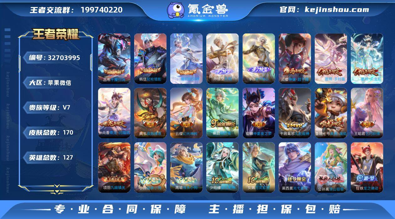 金标 哪吒 孙悟空 典韦 云中君 苹果微信134区170皮3典藏11传说2无双V7 营地ID1796423254荣耀王者【无双皮肤】:无相,碎月剑心【荣耀典藏】:弑枪猎影,最初的交响,千魇归渊【优质限定皮肤】:至尊宝【传说皮肤】:神骥·越千峰,久胜战神,战鼓燎原,寅虎·瑞焰,仲夏夜之梦,幻光神枪,愿照·众生和,愿照·岁时盈,鸣野蒿,乘龙·问璇玑,乞巧织情【史诗皮肤】:偶像歌手,幽灵船长,猫狗日记,线条小狗,无心,九幽镇关,月团寄思,巫礼祀神,功夫厨神,水果甜心,万灵启世,鹰眼统帅,光弋星穹,至尊宝,涂山容容,寅虎·御盾,乐园奇幻夜,圣诞狂欢,龙之律动,鸭鸭历险记,黎明之约,特工魅影,化蝶舞,紫霞仙子,苍穹之光,乘风破浪,未来纪元,电玩小子,心灵战警,青蛇,燃音魔法,乘龙·聚宝船,暗隐猎兽者,魔术师,皇家上将,摇滚巨星,逐浪之夏,魅力维加斯,纤云弄巧