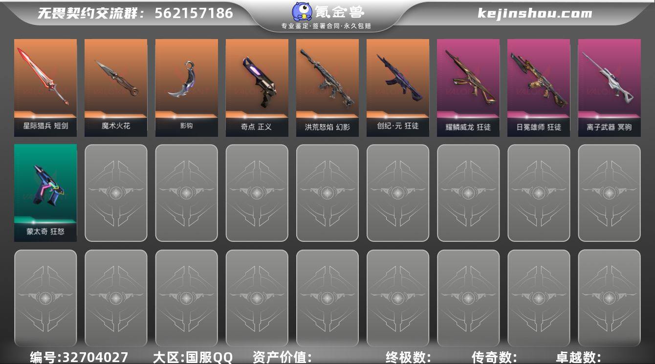 Q194211 无畏契约/等级97/段位未定级/英雄20/皮肤26/资产15100/已使用R点505/剩余R点100/星际猎兵-短剑,影钩,魔术火花,创·纪元-狂徒,洪荒怒焰-幻影,耀鳞威龙-狂徒-,日冕雄师-狂徒,离子武器-冥驹,奇点-正义