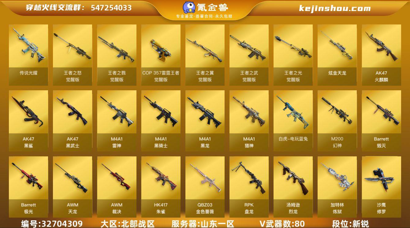 山东一区-94V-12王者武器数-1炫金武器数 【传说武器】:传说光耀(序列号版),传说光耀 【传说角色】:传说女帝 【热门武器】:传说光耀,QBZ03-金色蔷薇,HK417-朱雀,M200-幻神,M200-竞技荣光,死亡之眼,白虎-电玩蓝兔,柯尔特-冠军之特,金色小号,C.A.T,Cat-刀锋,M4A1-黑骑士*3,汤姆逊-烈龙*7,RPK-盘龙*3,加特林-炼狱*2,斯泰尔-蝴蝶,沙鹰-修罗*8 【王者炫金武器】:高爆手雷-雷霆王者,炫金天龙 【音效卡】:M200-幻神音效卡,AK47-火麒麟音效卡,M4A1-雷神音效卡,M4A1-黑龙音效卡,M4A1-黑骑士音效卡,Barrett-毁灭音效卡,Barrett-极光音效卡,QBZ03-金色蔷薇音效卡 【皮肤】:M200-幻神-黄忠皮肤,幻神-CFS2022,雷神-暗月,雷神-能量核心,雷神-星空,M4A1-雷神-CFS 2019,雷神-冠军之魄,火麒麟-雷神,火麒麟-平天大圣,毁灭耀金皮肤,毁灭-星空,毁灭-冠军之怒,黑龙-冠军之武,黑骑士耀金皮肤,极光-能量核心*2 【角色】:零,电竞教官-云悠悠,王者-瞳-闭月羞花,修道士,风暴女,嘉年华灵狐,斯沃特-X,铁骑-乘风破浪,铁骑荣耀,新娜塔莎 【人偶武器】:天龙-曼陀罗,火麒麟-灵狐,斯泰尔-蝴蝶,AWM-灵狐-15周年嘉年华,COP-旗袍,C.A.T,Cat-刀锋,...