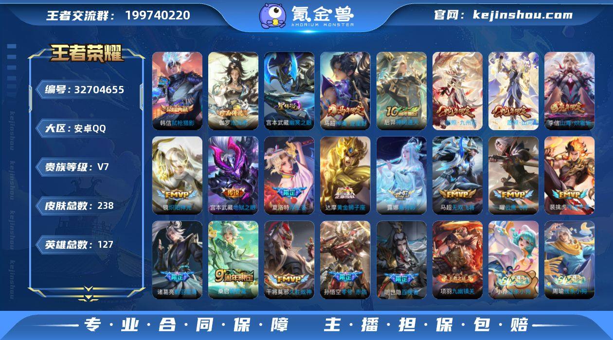 安卓Q-238皮肤-1典藏皮肤-1珍品传说-17传说-82史诗 【英雄全皮】:孙权全皮,敖隐全皮,司空震全皮,戈娅全皮 【荣耀典藏】:韩信弑枪猎影 【珍品传说】:伽罗沧流箭 【传说皮肤】:马超神骥逐星野,后羿神树通天,司空震愿照山河定,澜愿照九州拓,裴擒虎祥瑞亨通,桑启鸣野蒿,露娜霜月吟,诸葛亮鹤羽星尊,夏洛特浮生妄,李信山海炽霜斩,马超无双飞将,镜炽阳神光,孙悟空零号赤焰,曜云鹰飞将,干将莫邪久胜战神,达摩黄金狮子座,宫本武藏地狱之眼 【限定皮肤】:暃埋骨钱,蒙犽顽岩魄,蔡文姬夏日便利店,虞姬夏日便利店,姜子牙天穹之誓,李白谪仙醉月,狄仁杰阴阳师,赵云皇家上将,赵云百木心枪,庄周高山流水,高渐离玩趣恶龙,芈月幻夜卜梦,元歌无心,典韦岱宗,马可波罗山海玄木吟,狄仁杰魔术师,狄仁杰万华元夜,达摩沙漠行僧,项羽海滩派对,程咬金演武夺筹,韩信傲雪梅枪,兰陵王金庭之子,孙悟空至尊宝,孙悟空零号赤焰,刘备百相守梦,李元芳云中旅人,钟馗驱傩正仪,鬼谷子五谷丰年,诸葛亮鹤羽星尊,黄忠火炮绅士,苏烈千军破阵,沈梦溪大漠名商,裴擒虎擒涛扼浪,狂铁电玩高手,云中君时之祈愿,李信山海炽霜斩,猪八戒猪悟能,嫦娥拒霜思,西施玲珑珍...