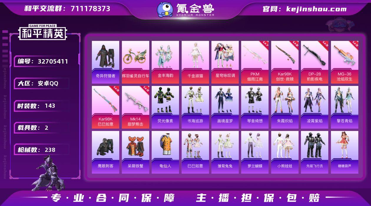 【941320】【满地铁天赋】YXc28416-【可二次】【因赛季更新游戏段付以上号为准!】 安卓Q-2稀有2载具3粉装8特效枪6热门143套装238枪皮 10印记 历史卓越王牌12星 【2稀有】 奇异狩猎者 AKM-缤纷海域 【2载具】 暮色幽蹄 辉羽雀灵自行车 【3粉装】 千金淑猫 金丰海韵 星穹咏叹调 【8特效枪】 Kar98K-巳巳如意 (5级) MG-36-沧焰双生 (5级) DP-28-豹影疾电 (5级) PKM-江南烟雨 (7级) M338-回旋牧梦使 (5级) Mk14-甜梦熊击 (5级) Kar98K-创世救赎 (6级) Mk14-福马献瑞 (5级) 【6热门】 龟仙人 晶辉守护 呆萌铁蟹 鹰眼刺客 漫步者 破蛋小黄鸡 【1背包】 梦幻火箭背包