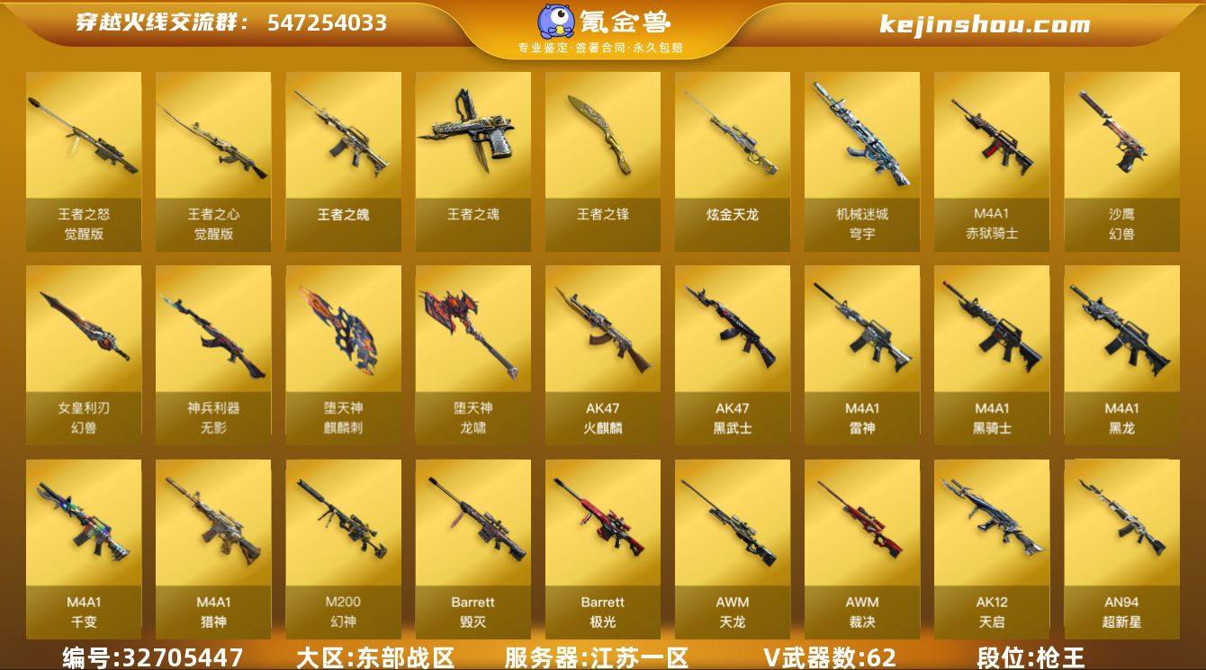 【941322】江苏一区-65V-6王者武器数-1炫金武器数 【热门武器】:QBZ03-金色蔷薇,M200-幻神,死亡之眼,M4A1-黑骑士,汤姆逊-烈龙*2,加特林-炼狱,沙鹰-修罗*4,高爆手雷-幻兽 【王者炫金武器】:王者之魄*2,王者之魂,王者之锋,炫金天龙 【音效卡】:Barrett-毁灭音效卡 【皮肤】:雷神-荣耀之魄,雷神-烈虎皮肤,火麒麟-百城,火麒麟-心动糖果,毁灭-暗月,毁灭-英雄计划 皮肤,黑龙-能量核心,黑骑士-暗月,战神-粉色甜心皮肤,战神-紫绶金章皮肤,战神-流金岁月皮肤,天龙-能量核心,极光-能量核心,修罗-能量核心,修罗-占星术 皮肤,天神-暗月*2 【角色】:魅影,王者-零,奇洋探员,乔伊教练,修道士,云海玲珑,暗夜-X,初恋灵狐,芳心审判者,风暴女*2,虎妞,嘉年华灵狐,兰-海滩派对,兰-新年限定,零-水下丽影,灵狐者-X,灵狐者-黄金海岸,灵狐者-七夕宝贝,龙儿,曼陀罗-X,潘多拉-X,潘多拉-甜心教官,斯沃特-X,铁骑荣耀,新灵狐者,影武者-X,潘多拉-N 【人偶武器】:巴雷特-零-水下丽影,AWM-灵狐-15周年嘉年华,COP-旗袍,夺魂,闪光弹-小乔,灵狐娃娃手雷*2 【暴走生化】:死亡之眼 【挑战大师】:冰龙粉碎者-白马银枪,激光毁灭者III,神圣爆裂者-末...