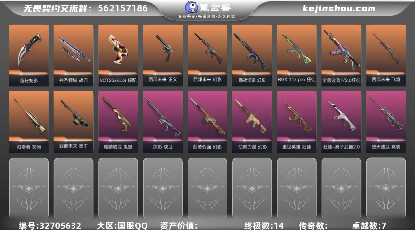 【套装】:西部未来套装 【英雄】:幻棱,炼狱,维斯,暮蝶,钛狐,壹决,铁臂,捷风,雷兹,幽影,不死鸟,贤者,猎枭,蝰蛇,零,芮娜,奇乐,尚勃勒,霓虹,斯凯,夜露,星礈,K/O,海神,盖可,黑梦,钢锁 【近战武器】:近战武器-紫金爪刀,近战武器-未来开拓者,近战武器-诡秘蛇影 军刀,近战武器-神圣领域 战刀 【狂徒】:狂徒-全息波普//2.0,狂徒-RGX 11z Pro,狂徒-盖世英雄,狂徒-离子武器//2.0,狂徒-诡秘蛇影 【幻影】:幻影-黯夜怪谈,幻影-西部未来,幻影-般若假面,幻影-侦察力量,幻影-神圣领域,幻影-末日之翼,幻影-西部未来 【戍卫】:戍卫-掠影,戍卫-月球哨兵,戍卫-折光棱晶 【獠犬】:獠犬-神圣领域 【冥驹】:冥驹-归零者,冥驹-堕天遗武,冥驹-星云暗涌 【飞将】:飞将-西部未来,飞将-末日之翼 【莽侠】:莽侠-诡秘蛇影,莽侠-月球哨兵 【战神】:战神-神圣领域 【奥丁】:奥丁-西部未来,奥丁-末日之翼 【判官】:判官-诡秘蛇影 【雄鹿】:雄鹿-月球哨兵 【骇灵】:骇灵-星云暗涌 【蜂刺】:蜂刺-星云暗涌,蜂刺-折光棱晶 【标配】:标配-折光棱晶 【VCT手枪】:标配-VCT25 x EDG 【正义】:正义-西部未来,正义-月球哨兵 【鬼魅】:鬼魅-耀鳞威...