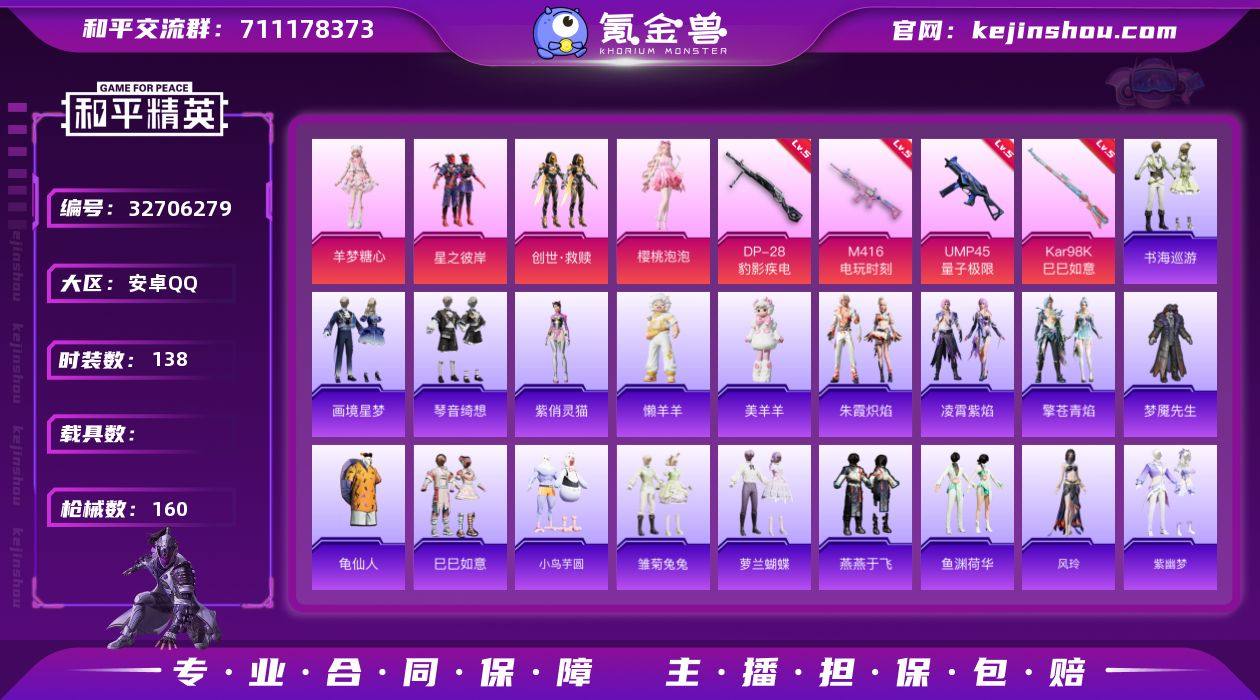 安卓 手Q-4粉装-5特效枪-0载具-1粉色飞行器-48927热力值-8王牌印记-138套装-160枪皮 【热门品类】:套装-龟仙人 【粉色套装】:粉装-星之彼岸,套装-创世·救赎,角色-樱桃泡泡,角色-羊梦糖心 【粉色枪皮等级】:M416-电玩时刻(五级),UMP45-量子极限(五级),Kar98K-巳巳如意(五级),Mk14-福马献瑞(五级),DP-28-豹影疾电(五级) 【粉色枪皮】:M416-电玩时刻,UMP45-量子极限,Kar98K-巳巳如意,Mk14-福马献瑞,DP-28-豹影疾电 【粉色飞行器】:炫彩糖果飞行器 【粉色降落伞】:星之彼岸降落伞,环太平洋降落伞,仲夏莫吉托降落伞,守护天翼降落伞,星穹咏叹调降落伞,幻彩电音降落伞,喜羊羊与灰太狼降落伞,炫彩糖果降落伞 【稀有套装】:套装-龟仙人,套装-巳巳如意,套装-小鸟芋圆,套装-炫彩糖果,角色-魂电,角色-幸运青,套装-马上有钱,套装-雏菊兔兔,套装-萝兰蝴蝶,套装-燕燕于飞,套装-鱼渊荷华,角色-风玲,套装-紫幽梦,套装-蓝冰羽,套装-星影赞美诗,套装-星渊小夜曲,套装-彩虹兔,套装-云朵鹅,套装-雪绒豹,角色-灵公主,套装-朱霞炽焰,套装-凌霄紫焰,套装-擎苍青焰,玩偶服-懒羊羊,玩偶服-美羊羊,角色-紫俏灵猫,套装-书海巡游,套装-画境星梦,套装-...