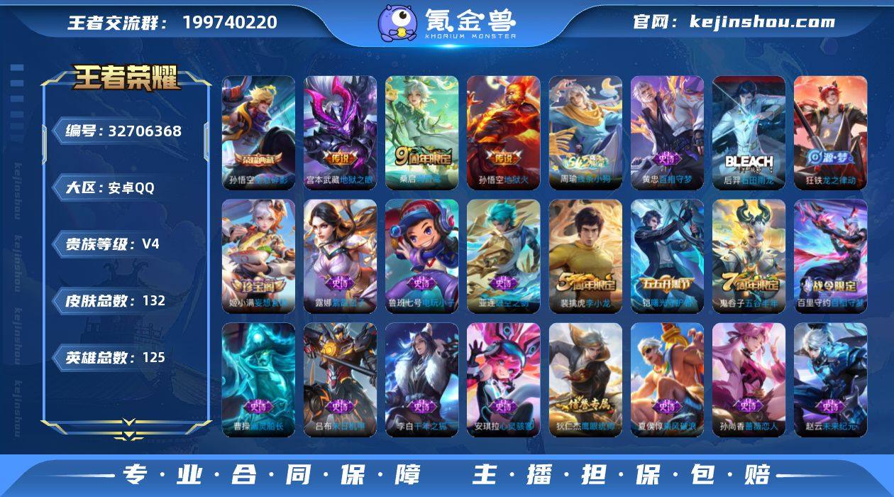 2655585 王者荣耀账号 安卓Q-V4-永恒钻石II段位-125英雄-132皮肤-1典藏皮肤-3传说-29史诗 【荣耀典藏】:孙悟空全息碎影 【传说皮肤】:桑启鸣野蒿,宫本武藏地狱之眼,孙悟空地狱火 【限定皮肤】:姜子牙天穹之誓,狄仁杰阴阳师,孙尚香蔷薇恋人,庄周高山流水,狄仁杰万华元夜,项羽海滩派对,程咬金演武夺筹,兰陵王金庭之子,李元芳云中旅人,钟馗驱傩正仪,鬼谷子五谷丰年,沈梦溪大漠名商,裴擒虎李小龙,鲁班大师探海日志,桑启海盐诗旅,张良古海寻踪,鬼谷子天穹祈灯,姬小满妄想食味,刘邦剑破天穹,周瑜熔金海岸 【赛季限定】:狄仁杰万华元夜,程咬金演武夺筹,钟馗驱傩正仪,兰陵王金庭之子,沈梦溪大漠名商,李元芳云中旅人,桑启海盐诗旅,鲁班大师探海日志,张良古海寻踪,鬼谷子天穹祈灯,刘邦剑破天穹,姜子牙天穹之誓,东皇太一噬灭天穹,亚瑟荣光之誓 【战令限定】:亚连破空之剑,孙悟空神迹守卫,百里守约百相守梦,老夫子百相守梦,周瑜线条小狗 【史诗皮肤】:周瑜线条小狗,黄忠百相守梦,后羿石田雨龙,狂铁龙之律动,百里守约百相守梦,亚连破空之剑,姬小满妄想食味,百里守约真我赫兹,鬼谷子五谷丰年,庄周高山流水,裴擒虎李小龙,狄仁杰鹰...