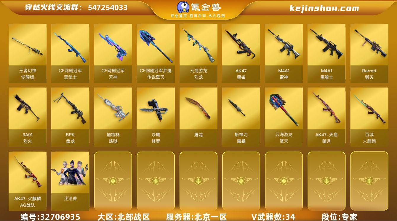 【941354】北京一区-36V-1王者武器数-0炫金武器数 【热门武器】:M4A1-黑骑士,RPK-盘龙,加特林-炼狱*2,斯泰尔-蝴蝶,USP-雷暴*2,沙鹰-修罗 【皮肤】:火麒麟-AG战队皮肤,火麒麟-百城,天启-暗月 【角色】:迷迭香,云海玲珑,暗夜-X,风暴女,曼陀罗-礼服,潘多拉-X 【人偶武器】:斯泰尔-蝴蝶,生化手雷-机甲核心 【挑战大师】:神圣爆裂者III,激光毁灭者III-白马银枪,惩戒者III 【英雄级武器】:M4A1-雷神,M4A1-黑骑士,AK47-黑鲨,9A91-烈火,黑武士-CF网剧冠军,Barrett-毁灭,王者幻神-觉醒版,RPK-盘龙,加特林-炼狱*2,烈龙-云海游龙,沙鹰-修罗,USP-雷暴*2,天神-CF网剧冠军,屠龙,擎天-云海游龙,斩神刀-雷暴,擎天-CF网剧冠军,高爆手雷-雷暴*5,手雷-云海游龙,闪光弹-雷暴*5,烟雾弹-雷暴*5 【源级武器】:源·火麒麟,御·黑龙-龙太子,魂·雷神-新春神龙,魂·黑骑士-娜塔莉娅,御·黑骑士·哪吒闹海,源·武圣,源·机械迷城,魂·HK417-朱雀-凤灵,源-金色蔷薇,源·天龙,魂·裁决-凤灵,魂·毁灭-航天科技,御·毁灭-黑大圣,魂·Barrett-朱雀- 新春神龙*2,魂·炼狱-蒸汽钟表,魂·修罗-神兵利器,源·天神,源·武圣glock,魂·屠龙-春桃,源·龙啸,魂·麒麟刺-神秘...