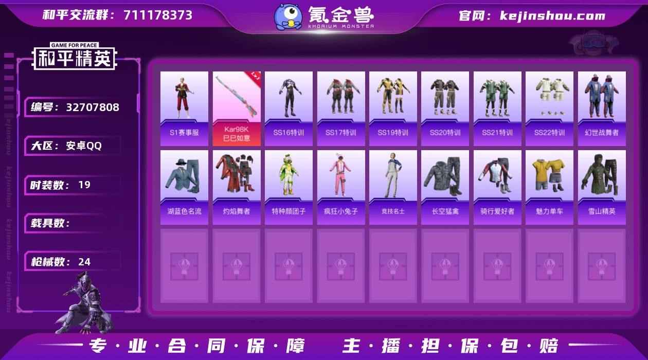 安卓【小号 套装-S1赛事,Kar98K-巳巳如意(一级)】 手Q-0粉装-1特效枪-0载具-0粉色飞行器-7714热力值-3王牌印记-19套装-24枪皮 【热门品类】:套装-S1赛事 【粉色枪皮等级】:Kar98K-巳巳如意(一级) 【粉色枪皮】:Kar98K-巳巳如意 【稀有枪皮】:AKM-灼热熔岩,M16A4-幻世战舞者,SCAR-L-炫彩节奏,SCAR-L-生命誓言,SCAR-L-红色方程式,M416-葫芦兄弟,M416-蓝色火焰,Kar98K-红色方程式,M24-奇异狩猎者,QBU-烈焰拳霸,M249-百万伏特,DP-28-橘柚倾心 【其他套装】:套装-SS16特训,套装-SS17特训,套装-SS19特训,套装-SS20特训,套装-SS21特训,套装-SS22特训,套装-幻世战舞者,套装-湖蓝色名流,套装-灼焰舞者,套装-特种颜团子,套装-疯狂小兔子,套装-竞技名士,套装-长空猛禽,套装-骑行爱好者,套装-魅力单车,套装-雪山精英 【稀有头盔】:深海小丑鱼头盔(1级) 【营地ID】:1032992488