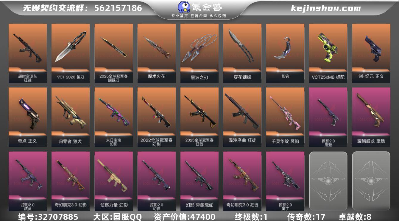 【自带包赔 可赔三倍】:22+25+26VCT多限定成品号,库存价值47400 【限定】: VCT 2026 篆刀, 2025全球冠军赛 狂徒, 2025全球冠军赛 蝴蝶刀, 2022全球冠军赛 幻影 【近战】: VCT 2026 篆刀, 黑波之刃, 2025全球冠军赛 蝴蝶刀, 魔术火花, 影钩, 穿花蝴蝶 【狂徒】: 2025全球冠军赛 狂徒, 奇幻朋克//3.0 狂徒, 超时空卫队 狂徒, 混沌序曲 狂徒,荆刺圣骸 狂徒 【幻影】: 末日泡泡 幻影, 奇幻朋克//3.0 幻影, 掠影//2.0 幻影, 2022全球冠军赛 幻影, 异鳞魔蛇 幻影 【冥驹】: 千灵华绽 冥驹 【正义】: 创·纪元 正义 【獠犬】: 归零者 獠犬 【鬼魅】: 掠影//2.0 鬼魅, 耀鳞威龙 鬼魅 【骇灵】: 掠影//2.0 骇灵 【标配】: VCT25 x M8 标配 【奥丁】: 掠影//2.0 奥丁 【充值总皮肤】: VCT 2026 篆刀, 黑波之刃, 2025全球冠军赛 狂徒, 2025全球冠军赛 蝴蝶刀, 末日泡泡 幻影, 魔术火花, 奇幻朋克//3.0 幻影, 奇幻朋克//3.0 狂徒, 归零者 獠犬, 影钩, 掠影//2.0 幻影, 掠影//2.0 奥丁, 掠影//2.0 鬼魅, 掠影//2.0 骇灵, VCT25 x M8 标配, 超时空卫队 狂徒, 创·纪元 正义, 2022全球冠军赛 幻影, 千灵华绽 冥驹, 混沌序曲 狂徒, 穿花蝴蝶, 耀鳞威龙 鬼魅, 异鳞魔蛇 幻影 【概...