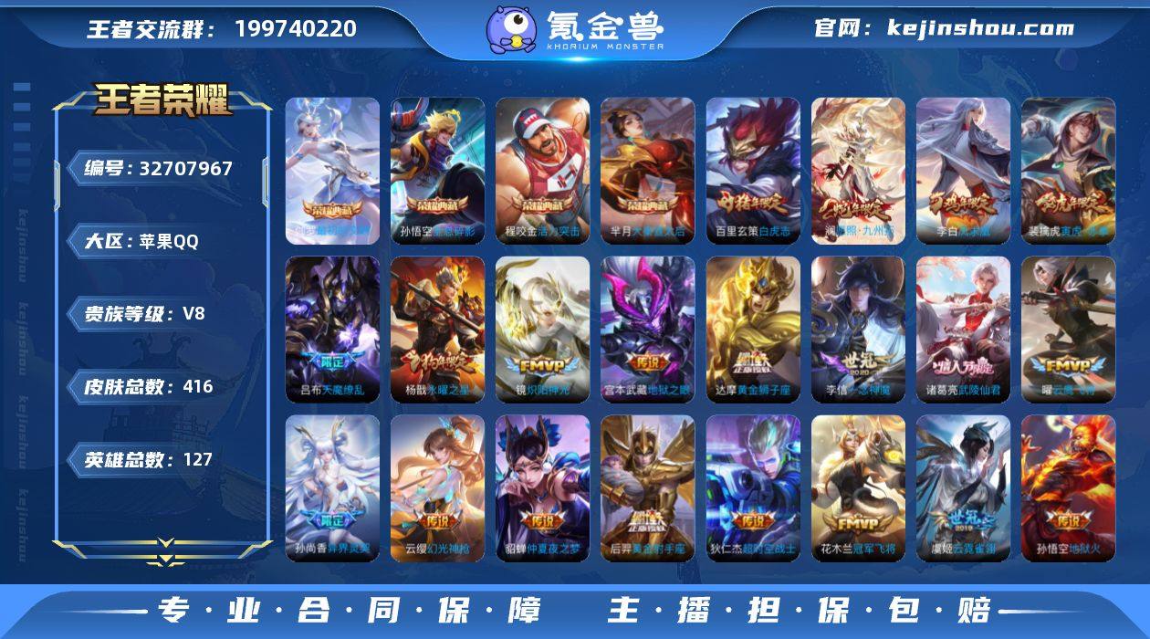 【aswz1851】国标账号 苹果Q-V8国标典韦 金标程咬金 -127英雄-416皮肤-4典藏皮肤-24传说-135史诗 【英雄全皮】:刘禅全皮,孙权全皮,雅典娜全皮,黄忠全皮,狂铁全皮,猪八戒全皮,敖隐全皮,蒙恬全皮 【荣耀典藏】:孙悟空全息碎影,芈月大秦宣太后,程咬金活力突击,伽罗最初的交响 【传说皮肤】:澜愿照九州拓,云缨幻光神枪,澜电玩雷克斯,孙尚香音你闪耀,裴擒虎寅虎赤拳,孙尚香异界灵契,铠绛天战甲,镜炽阳神光,虞姬启明星使,曜云鹰飞将,李信一念神魔,虞姬云霓雀翎,达摩黄金狮子座,百里玄策白虎志,花木兰冠军飞将,后羿黄金射手座,杨戬永曜之星,诸葛亮武陵仙君,貂蝉仲夏夜之梦,李白凤求凰,宫本武藏地狱之眼,孙悟空地狱火,吕布天魔缭乱,狄仁杰超时空战士 【限定皮肤】:白起狰,狄仁杰阴阳师,虞姬凯尔特女王,廉颇寅虎御盾,赵云皇家上将,赵云引擎之心,墨子神迹守卫,妲己热情桑巴,嬴政白昼王子,孙尚香蔷薇恋人,孙尚香异界灵契,鲁班七号狮舞东方,庄周云端筑梦师,庄周高山流水,阿轲迷踪丽影,钟无艳超时空战士,孙膑妖精王,孙膑天狼运算者,孙膑寅虎展翼,扁鹊炼金王,白起夜都怪侠,芈月重明,芈月幻夜卜梦,吕布天魔缭乱,吕布猎兽之王...