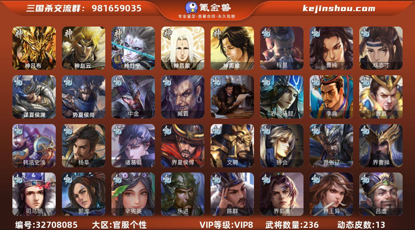 【2795】官阶:骠骑将军;VIP等级:VIP8;史诗武将数量:12;动态皮肤数量:13;武将总数:236;史诗宝珠数量:0;将魂数量:446;神将:3;魏国史诗武将:2;蜀国史诗武将:1;吴国史诗武将:1;群史诗武将:4 神吕布,神赵云,神甘宁,曹纯,戏志才,程昱,谋夏侯氏,界徐盛,张让,星甘宁,谋吕布,兀突骨,神吕蒙,神周瑜,势夏侯尚,SP关羽,乐进,曹昂,诸葛诞,朱灵,文聘,SP姜维,钟会,曹冲,郭淮,满宠,界王异,界曹操,界司马懿,界夏侯惇,界张辽,界郭嘉,李典,曹真,韩浩史涣,陈群,曹叡,曹休,钟繇,司马朗,辛宪英,吕虔,鲁芝,杜畿,界曹丕,界曹植,界郭淮,崔琰,杨阜,谋于禁,谋夏侯渊,牛金,臧霸,唐咨,势陈到,SP孙尚香,关银屏,夏侯霸,马良,关兴张苞,廖化,界马岱,关平,简雍,刘封,界法正,界关兴张苞,界刘备,界赵云,界马超,SP徐庶,吴懿,周仓,张松,刘谌,糜竺,马忠,李严,黄皓,界诸葛亮,严颜,界孟获,吕凯,邓芝,傅肜,界周仓,谋庞统,界张嶷,谋姜维,谋张飞,诸葛果,糜芳傅士仁,甘夫人,凌操,大乔小乔,诸葛恪,诸葛瑾,孙鲁育,程普,韩当,潘璋马忠,虞翻,界甘宁,界吕蒙,界黄盖,界周瑜,界大乔,界陆逊,孙鲁班,朱桓,顾雍,孙休,全琮,界孙权,界孙尚香,潘濬,严畯,吕岱,卫温诸葛直,界凌统,界韩当,吕范,濮阳兴,界朱治,孟达,伏完,刘协,界袁...