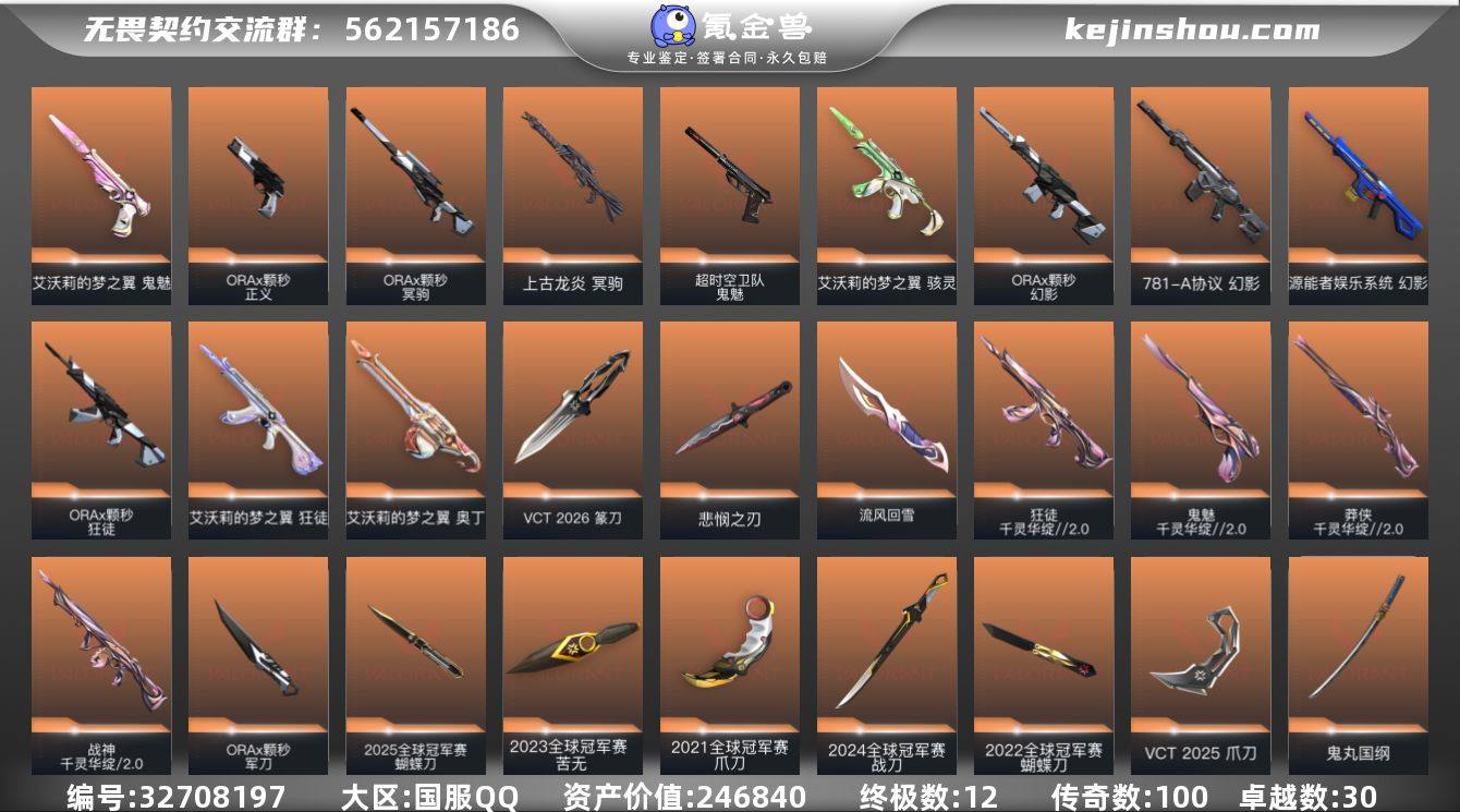 【自带包赔 可赔三倍】:库存价值246840 极品全冠军限定 号商还有8200点卷 极品大号 当前白银 历史钻石 【限定】: VCT 2026 篆刀, 无畏契约季前邀请赛 悲悯之刃, 2025全球冠军赛 狂徒, 2025全球冠军赛 蝴蝶刀, 5周年//公测重制版 苍龙之刃, 2022全球冠军赛 幻影, 2022全球冠军赛 蝴蝶刀, VCT 2025 爪刀, 双城之战 狂徒, 双城之战 拳套, 2024全球冠军赛 幻影, 2024全球冠军赛 战刀, 2021全球冠军赛 狂徒, 2021全球冠军赛 爪刀, 2023全球冠军赛 狂徒, 2023全球冠军赛 苦无 【近战】: 天御刀, VCT 2026 篆刀, 无畏契约季前邀请赛 悲悯之刃, 流风回雪, ORA x 颗秒 军刀, 2025全球冠军赛 蝴蝶刀, 5周年//公测重制版 苍龙之刃, 2022全球冠军赛 蝴蝶刀, 神之刃, 离子武器//2.0 爪刀, 未来开拓者, VCT 2025 爪刀, 双城之战 拳套, 鬼丸国纲, 奇点//2.0 蝴蝶刀, 2024全球冠军赛 战刀, RGX 11z Pro//3.0 爪刀, 艾沃莉的魔法棒, 落英飞旋, 洪荒双斩, 2021全球冠军赛 爪刀, 黑波之刃, 澄湖潋滟, 天玄刀, 偃月, 2023全球冠军赛 苦无 【狂徒】: 日冕雄师 狂徒, 创·纪元 狂徒, 千灵华绽//2.0 狂徒, ORA x 颗秒 狂徒, 噬影者 狂徒, 多弥尔的复仇 狂徒, 2025全球冠军赛 狂徒, 离子武器//2.0...
