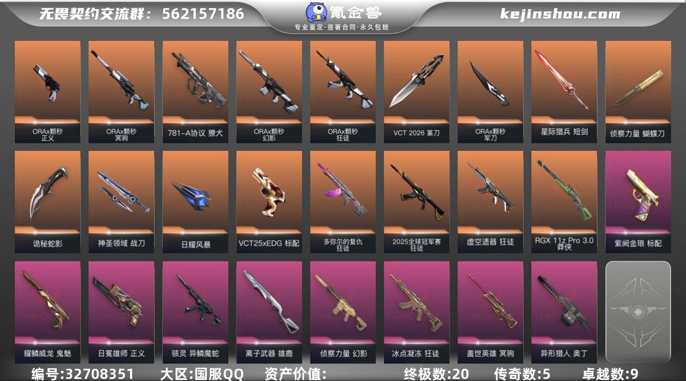 【套装】:荆刺圣骸套装,VCT 2026 赛季套装,ORA x 颗秒套装【英雄】:幻棱,炼狱,维斯,暮蝶,钛狐,壹决,铁臂,捷风,雷兹,幽影,不死鸟,贤者,猎枭,零,芮娜,奇乐,尚勃勒,霓虹,斯凯,夜露,星礈,K/O,海神,盖可,黑梦,钢锁【近战武器】:近战武器-荆刺链刃,近战武器-碎心裂刃,近战武器-VCT 2026 篆刀,近战武器-ORA x 颗秒 军刀,近战武器-侦察力量 蝴蝶刀,近战武器-镭切,近战武器-诡秘蛇影 军刀,近战武器-神圣领域 战刀,近战武器-日耀风暴 遗器,近战武器-星际猎兵 短剑【狂徒】:狂徒-2025全球冠军赛,狂徒-虚空遗器,狂徒-多弥尔的复仇,狂徒-ORA x 颗秒,狂徒-荆刺圣骸,狂徒-冰点凝冻,狂徒-诡秘蛇影【幻影】:幻影-ORA x 颗秒,幻影-侦察力量,幻影-神圣领域,幻影-末日之翼【戍卫】:戍卫-荆刺圣骸,戍卫-月球哨兵,戍卫-折光棱晶【獠犬】:獠犬-781-A协议,獠犬-神圣领域【冥驹】:冥驹-ORA x 颗秒,冥驹-盖世英雄,冥驹-星云暗涌【飞将】:飞将-荆刺圣骸,飞将-末日之翼【莽侠】:莽侠-RGX 11z Pro//3.0,莽侠-诡秘蛇影,莽侠-月球哨兵【战神】:战神-神圣领域【奥丁】:奥丁-异形猎人,奥丁-末日之翼【判官】:判官-诡秘蛇影【雄鹿】:雄鹿-...