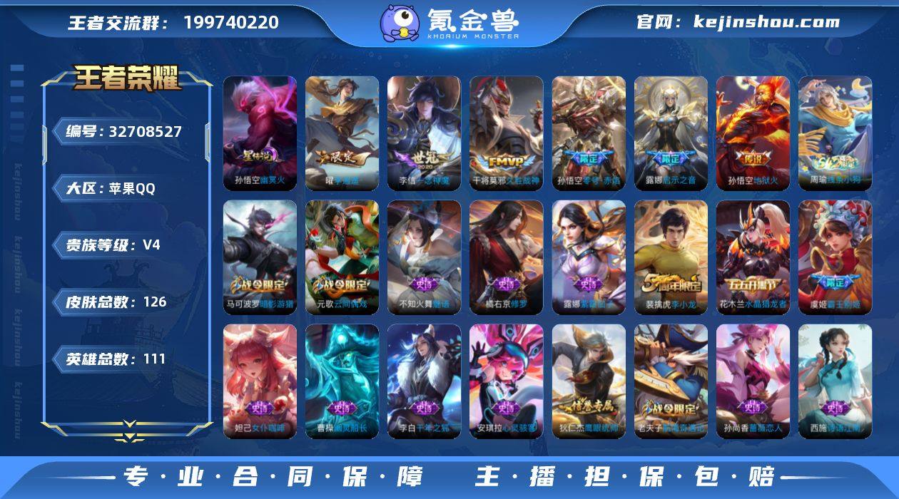 苹果Q-V4-至尊星耀III段位-111英雄-126皮肤-6传说-40史诗【传说皮肤】:露娜启示之音,曜李逍遥 ,孙悟空零号赤焰,李信一念神魔,干将莫邪久胜战神,孙悟空地狱火 幽冥火【限定皮肤】:狄仁杰阴阳师,赵云皇家上将,墨子神迹守卫,嬴政优雅恋人,孙尚香蔷薇恋人,阿轲迷踪丽影,元歌云间偶戏,马可波罗暗影游猎,狄仁杰魔术师,狄仁杰万华元夜,达摩星际陆战队,达摩沙漠行僧,项羽海滩派对,老夫子醍醐杖,老夫子航海奇遇记,程咬金演武夺筹,露娜启示之音,刘邦夺宝奇兵,兰陵王金庭之子,亚瑟潮玩骑士王,孙悟空零号赤焰,李元芳云中旅人,虞姬霸王别姬,钟馗驱傩正仪,雅典娜单词大作战,雅典娜黎明之约,鬼谷子原初探秘者,苏烈千军破阵,百里玄策原初追逐者,弈星混沌棋,沈梦溪大漠名商,明世隐疑决卦,裴擒虎李小龙,猪八戒西部大镖客,曜李逍遥 ,蒙犽狂想玩偶喵,鲁班大师探海日志,镜匿光追影者,桑启海盐诗旅,鬼谷子天穹祈灯【赛季限定】:弈星混沌棋,明世隐疑决卦,老夫子醍醐杖,鬼谷子原初探秘者,狄仁杰万华元夜,程咬金演武夺筹,钟馗驱傩正仪,苏烈千军破阵,达摩沙漠行僧,兰陵王金庭之子,沈梦溪大漠名商,李元芳云中旅人,桑启海盐诗旅,鲁班大师探海...