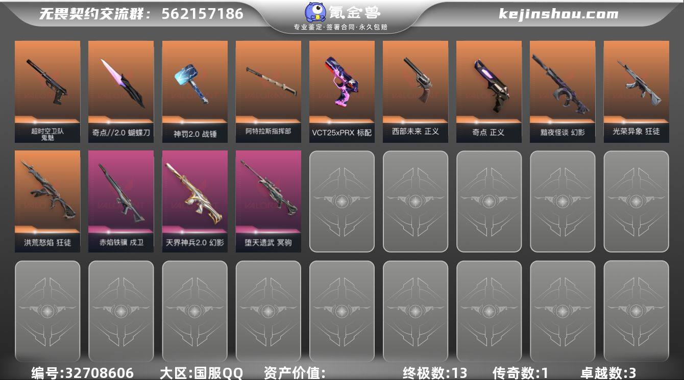 【英雄】:幻棱,炼狱,维斯,暮蝶,钛狐,壹决,铁臂,捷风,雷兹,幽影,不死鸟,贤者,猎枭,蝰蛇,零,芮娜,奇乐,尚勃勒,霓虹,斯凯,夜露,星礈,K/O,海神,盖可,黑梦,钢锁【近战武器】:近战武器-碎心裂刃,近战武器-剥皮小刀,近战武器-奇点//2.0 蝴蝶刀,近战武器-天御刀,近战武器-神罚//2.0 战锤,近战武器-阿特拉斯指挥部 甩棍【狂徒】:狂徒-洪荒怒焰,狂徒-光荣异象【幻影】:幻影-黯夜怪谈,幻影-天界神兵//2.0【戍卫】:戍卫-赤焰铁骥【冥驹】:冥驹-堕天遗武【骇灵】:骇灵-无限竞技【VCT手枪】:标配-VCT25 x PRX【正义】:正义-奇点,正义-西部未来【鬼魅】:鬼魅-超时空卫队【卡面】:从黄昏到黎明 卡面,银弹猎手 卡面,欢迎来到底城 卡面,南瓜盛典 卡面,正义的化身 卡面,归乡 // 蝰蛇 卡面,Clutch 卡面,失控边缘 卡面,无畏契约GO!第一卷:芮娜 卡面,盖可工牌 卡面,无畏契约GO!第一卷:零 卡面,《双城之战》金克丝 卡面,钢锁vs盖可 卡面,代号红色 卡面,新兵报到 卡面,V契约 卡面,无畏契约 卡面【喷漆】:纳米打击 喷漆,熊抱 喷漆,买装还是存钱 喷漆,关门放狗 喷漆,胜利属于无畏契约 喷漆,GLHF 喷漆,无畏契约 喷漆【挂饰】:...