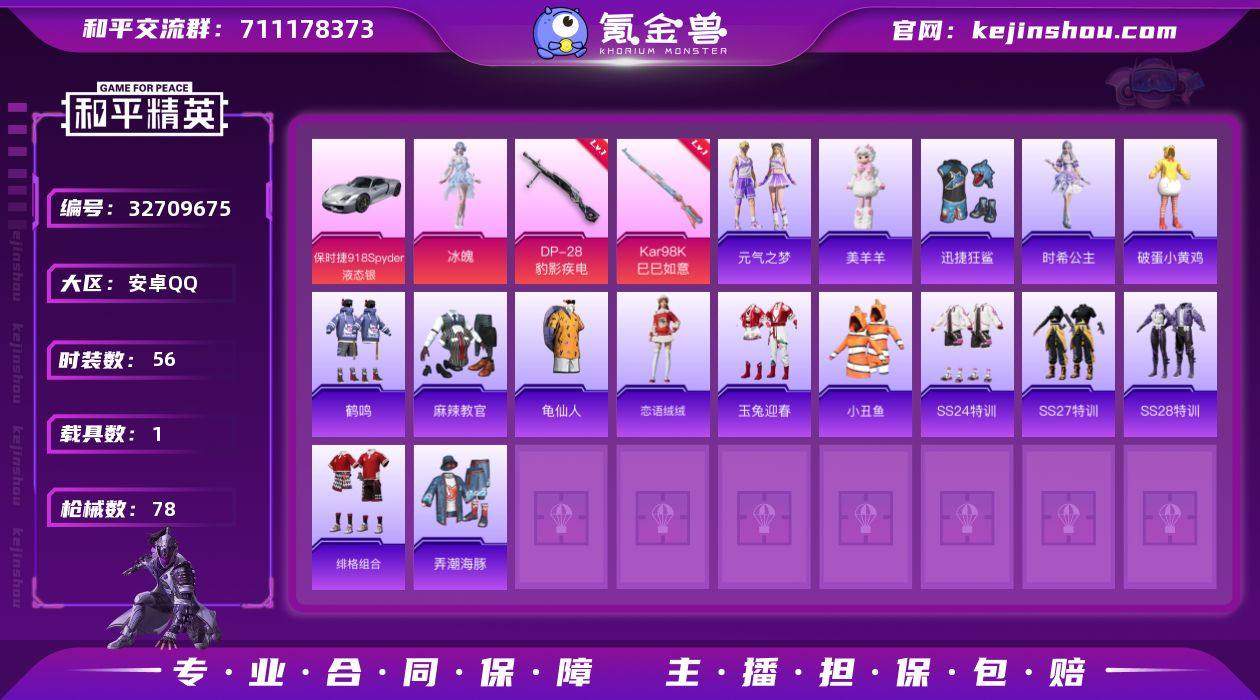 M1047227有二次【1载具-1粉装-2特效枪 角色-冰魄 小丑鱼】 安卓手Q-1载具-1粉装-2特效枪-56套装-78枪皮-3王牌印记-荣耀皇冠Ⅱ-22643热力值【1载具】保时捷918 Spyder(液态银)【1粉装】角色-冰魄【2特效枪】Kar98K-巳巳如意[5级],DP-28-豹影疾电[5级]【1稀有】小丑鱼【2飞行器】顶峰精英尾迹,空岛之星尾迹【1背包】深海小丑鱼背【130其它衣服和枪皮】鹤鸣,朱霞炽焰,角色-时希公主,和煦暖阳,SS36特训,龙魂突击队,空岛之星,凌霄紫焰,飞行日记,迅捷狂鲨,萌鸡速递,破蛋小黄鸡,破晓战魂,战术大师,王牌教练,田园牧歌,柠萌假日,玩偶服-美羊羊,冷焰舞者,狙击之神,SS34特训,幻世战舞者,SS23特训,光之冒险,SS22特训,恋语绒绒,白色伏地魔,SS33特训,SS20特训,SS27特训,长空猛禽,麻辣教官,SS28特训,SS37特训,魅力单车,玉兔迎春,千禧之恋,SS21特训,龟仙人,牛气满满,轻风白浪,弄潮海豚,元气之梦,老实芭蕉,特殊使命,缤纷果语,霓虹街区,绯格组合,黑色伏地魔,SS35特训,SS24特训,竞技名士,热血青春,海岛探路者,平底锅-凌霄紫焰,AKM-破晓战魂,MG3-幻世战舞者,UMP45-蓝色火焰,Vector-荒原烈焰,Mk14-冰河战士,汤姆逊-像素花束,ARX-凌霄紫焰,VSS-田园牧歌,MG3-乌木金纹,莫辛纳甘-乌木金纹,AUG-天降萌叽,...