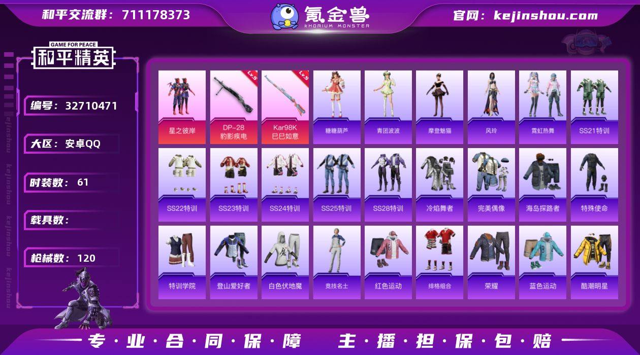 安卓 手Q-1粉装-4特效枪-0载具-1粉色飞行器-29617热力值-1王牌印记-61套装-120枪皮 【粉色套装】:粉装-星之彼岸 【粉色枪皮等级】:ACE32-萌骑漫游(四级),Kar98K-巳巳如意(五级),Mk14-福马献瑞(五级),DP-28-豹影疾电(五级) 【粉色枪皮】:ACE32-萌骑漫游,Kar98K-巳巳如意,Mk14-福马献瑞,DP-28-豹影疾电 【粉色飞行器】:炫彩糖果飞行器 【粉色降落伞】:星之彼岸降落伞,忍者神龟降落伞,炫彩糖果降落伞 【稀有套装】:套装-雪国风尚,套装-马上有钱,套装-糖糖葫芦,套装-青团波波,角色-摩登魅猫,角色-风玲,套装-霓虹热舞 【稀有枪皮】:AKM-彩虹符号,AKM-破晓战魂,AKM-龙的传人,M16A4-蓝色火焰,SCAR-L-夜灯,SCAR-L-玉兔迎春,M416-糯团青竹,M416-红色方程式,M416-绯红前夜,M416-蓝色火焰,AUG-天降萌叽,AUG-耀粉歌者,M762-天降萌叽,M762-彩虹符号,AC-VAL-天降萌叽,蜜獾-垂柳戏鸭,蜜獾-天降萌叽,蜜獾-娇憨猪猪,UZI-天降萌叽,UZI-娇憨猪猪,UMP45-夜灯,UMP45-蓝色火焰,Vector-生命誓言,汤姆逊-天降萌叽,P90-甜蜜旋律,Kar98K-红色方程式,SKS-糯团青竹,Mini14-梦幻火箭,Mini14-耀粉歌者,Mk14-治愈之星,SLR-娇憨猪猪,AMR-妙红点点,M417-...