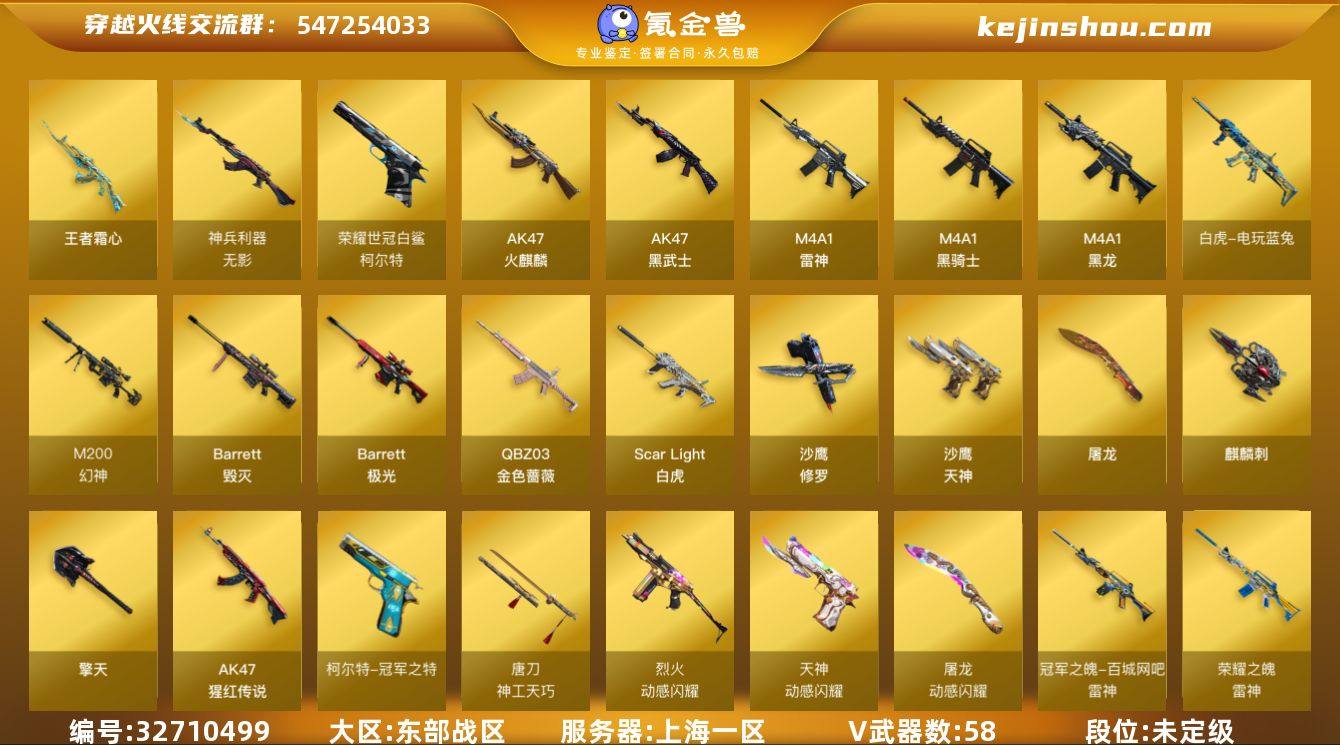 上海一区-62V-6王者-0炫金 【热门武器】:QBZ03-金色蔷薇,Scar Light-白虎,M200-幻神*2,柯尔特-荣耀世冠白鲨2023,白虎-电玩蓝兔,柯尔特-冠军之特,M4A1-黑骑士,加特林-炼狱,金色蔷薇-空,火麒麟-绝迹,沙鹰-修罗*2,Knife-冠军之刃,黄金猫猫手套-白鲨 【王者炫金武器】:王者霜心 【音效卡】:M200-幻神音效卡,M4A1-黑龙音效卡,M4A1-黑骑士音效卡,沙鹰-修罗-盛典舞曲音效卡*2,炼狱-百战金芒-庆典舞曲音效卡,火线妹语音包 【皮肤】:M200-幻神-黄忠皮肤,幻神-AG-CFPLS17冠军,幻神-丹凤,幻神-荣耀世冠白鲨2023 皮肤,幻神-传奇欧欧 皮肤,幻神-荣耀世冠EP 皮肤,幻神-电竞之星 皮肤,白虎-电玩粉兔皮肤,QBZ03-传奇宠儿,金色蔷薇-破浪逐光 皮肤,QBZ03-荣耀世冠EP 皮肤,雷神-荣耀之魄,雷神-冠军之魄,雷神-脉冲核心,雷神-宇航兔皮肤,雷神-动感闪耀 皮肤,雷神-源计划2.0专属 皮肤,M4A1-再燃火线,雷神-神秘按键 皮肤,火麒麟-战神关羽,火麒麟-平天大圣,火麒麟-白虎,火麒麟-百城,火麒麟-大唐荣光,火麒麟-心动糖果,毁灭-冠军之怒,毁灭-战神张飞,毁灭-黑大圣皮肤,毁灭-英雄计划 皮肤,黑龙-能量核心,黑龙-墨子皮肤,黑骑士-冠军之势,战神-粉色甜...